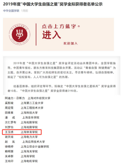 本网讯 日前,由共青团中央、全国学联指导,中国青年报社、新东方教育科技集团联合开展的2019年度“中国大学生自强之星”奖学金结果公示。经学校推荐、市级推荐、全国评定等环节,我校心理学院王玉绣同学荣获“中国大学生自强之星”奖学金。