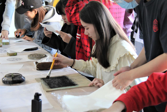 最后同学们在老师的指导下进行了手工拓印,就拓印纸张及拓印方法提出了很多问题,王美玉老师一一耐心解答,给大家讲解并展示蜡拓和木板拓印的操作手法以及两者区别。现场的学员们受益匪浅,同时对古籍和家谱制作展现出了浓厚的兴趣。