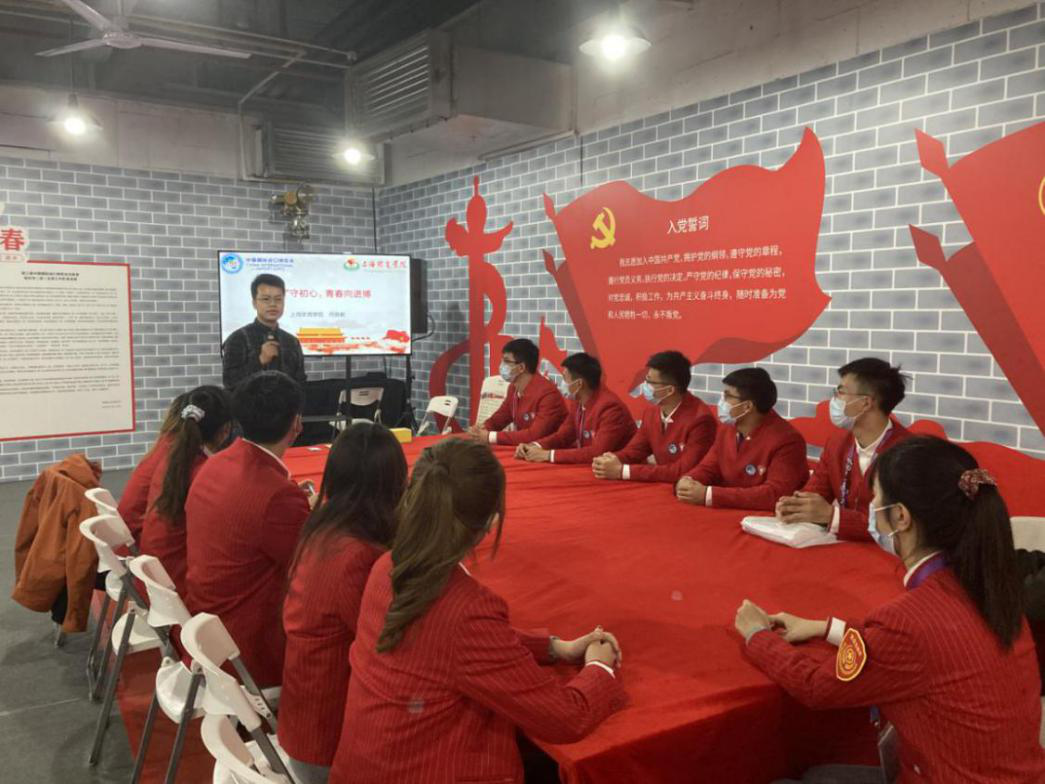 在本次进博会志愿者服务中,我校临时党团支部发挥了关键作用,预备党员和入党积极分子主动担任了各个岗位小组的负责人,更在实际工作中起到了模范带头作用。11月8日,临时党支部在书记何俊毅老师的带领下,在“小叶子”之家,以“四史”守初心,青春向进博为主题,围绕“四史”进行了学习教育的支部活动。