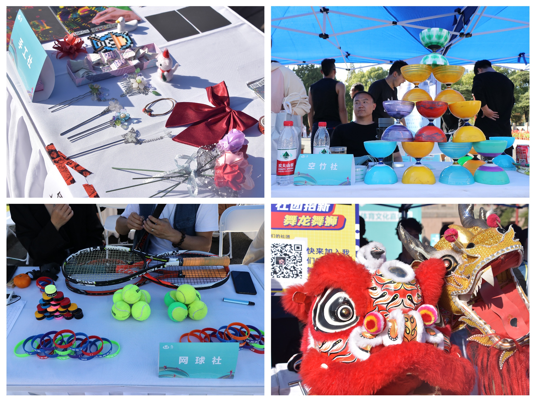 而在台下围场的体验区内,48个参会社团都摆出了自己的宣传物料,积极展示、热络招新。有的拿出了自己手工制作的小摆件,有的现场弹唱表演,有的手把手教同学专业项目动作要领。社团成员们积极卖力地推介自己热爱的兴趣社团,参与活动的师生也在热络的现场氛围的感染下体会到校园社团文化的独特魅力。