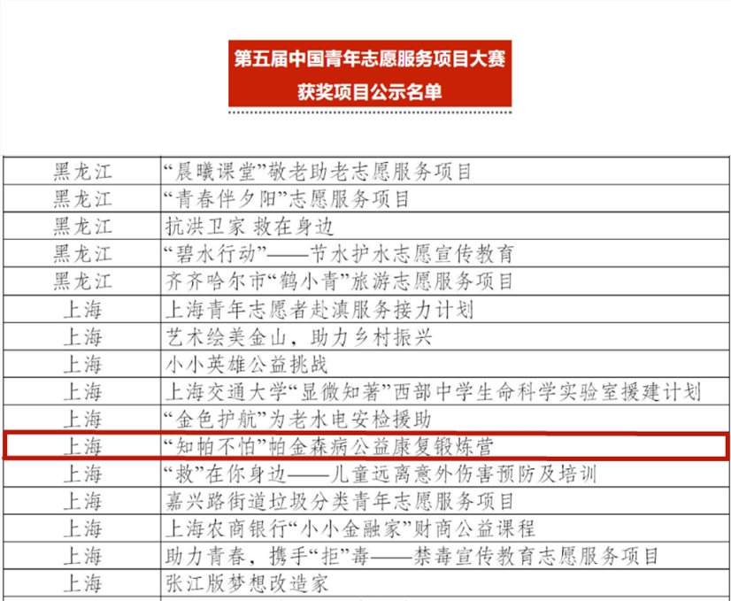中国青年志愿者服务项目大赛是团中央深入学习贯彻习近平总书记系列重要讲话精神和中央党的群团工作会议精神,增强共青团和青年志愿者工作政治性、先进性、群众性,推动共青团和青年志愿者工作创新创业创优的重要举措。本届大赛由共青团中央、中央文明办、民政部等7部委共同主办。通过38个省级赛会单位和行业赛主办单位推报的项目1202个,经过全国赛初评评审,共有1000个项目进入终评评审。与往届不同,本次大赛采用线上与线下相结合的形式全国赛终评,这种新的评审形式不仅是适应疫情防控要求的新尝试,更为志愿服务事业的发展带来新视角。我校“知帕不怕”帕金森病康复锻炼营项目在全国范围内取得了广泛的社会认可,搭建了以体育运动提升市民健康水平的有效载体,形成了健康科普领域可复制、可推广的上海模式。