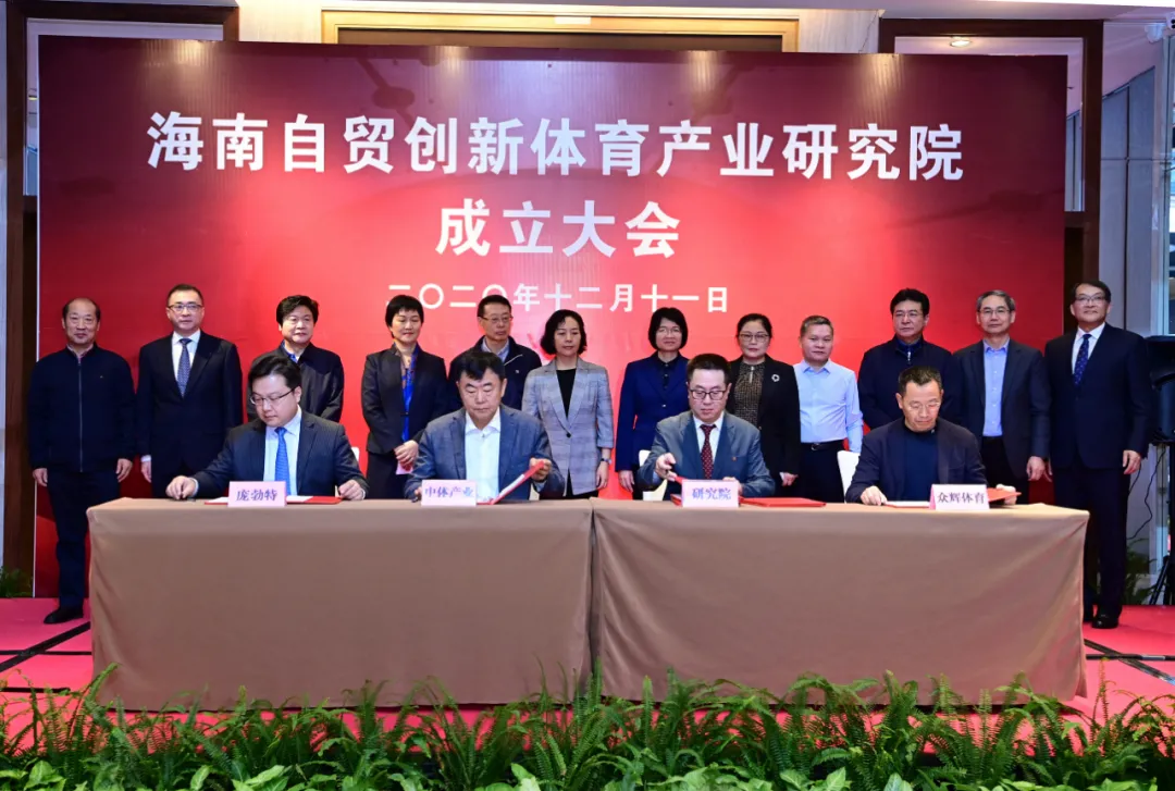 在成立大会上,刘扶民司长、张宇贤主任、司海英副秘书长、彭维勇副司长、徐翔鸿副厅长、杨玲副书记等领导向北京体育大学体育休闲与旅游学院副院长蒋依依、中体产业董事长王卫东等21名研究院专家委员会成员颁发聘书。此外,研究院理事长施之皓与中体产业董事长王卫东、众辉体育董事长陆浩、庞勃特科技公司董事长杨跞进行了现场签约,双方将在人才培养、体旅融合、智慧体育等方面开展合作,为海南自贸港建设添砖加瓦。