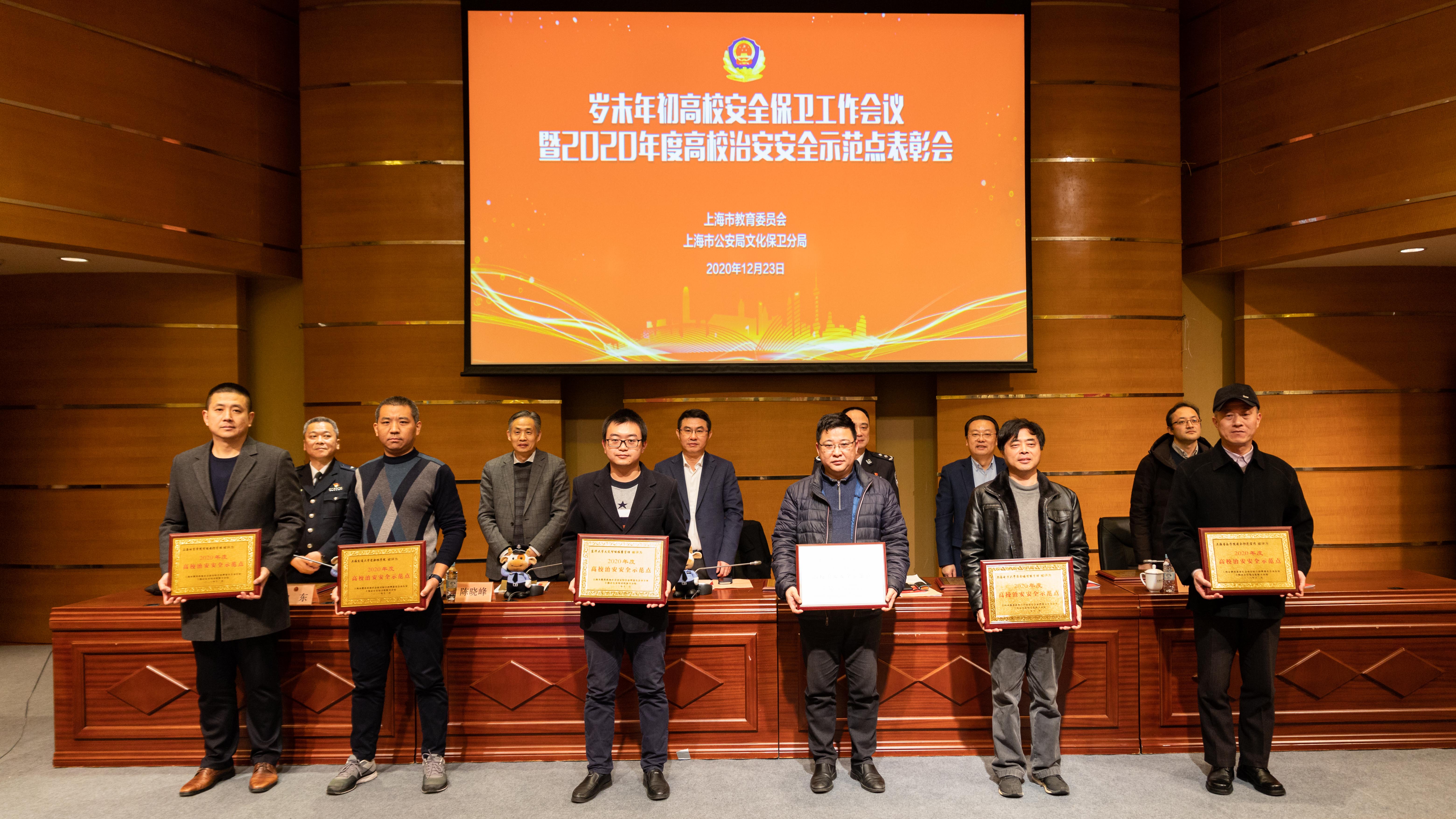 会上,市教卫党委、教委和文保分局的领导向来自本市24个获得“2020年度高校治安安全示范点”的单位颁奖,我校的“智能安防管理工作法”获此殊荣,这是我校保卫处继获得“上海市安全文明校园”、“平安校园”后,又一荣誉称号。