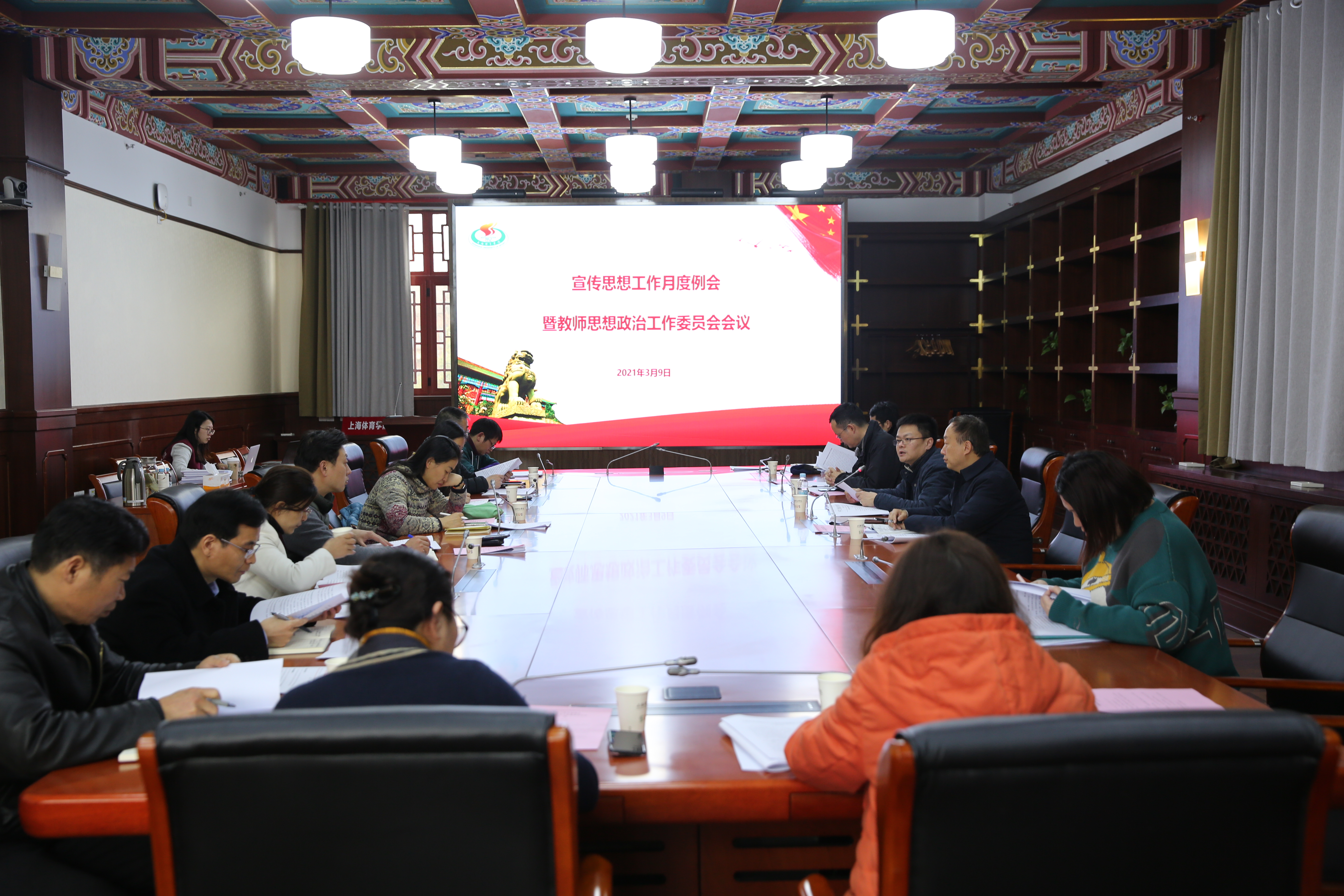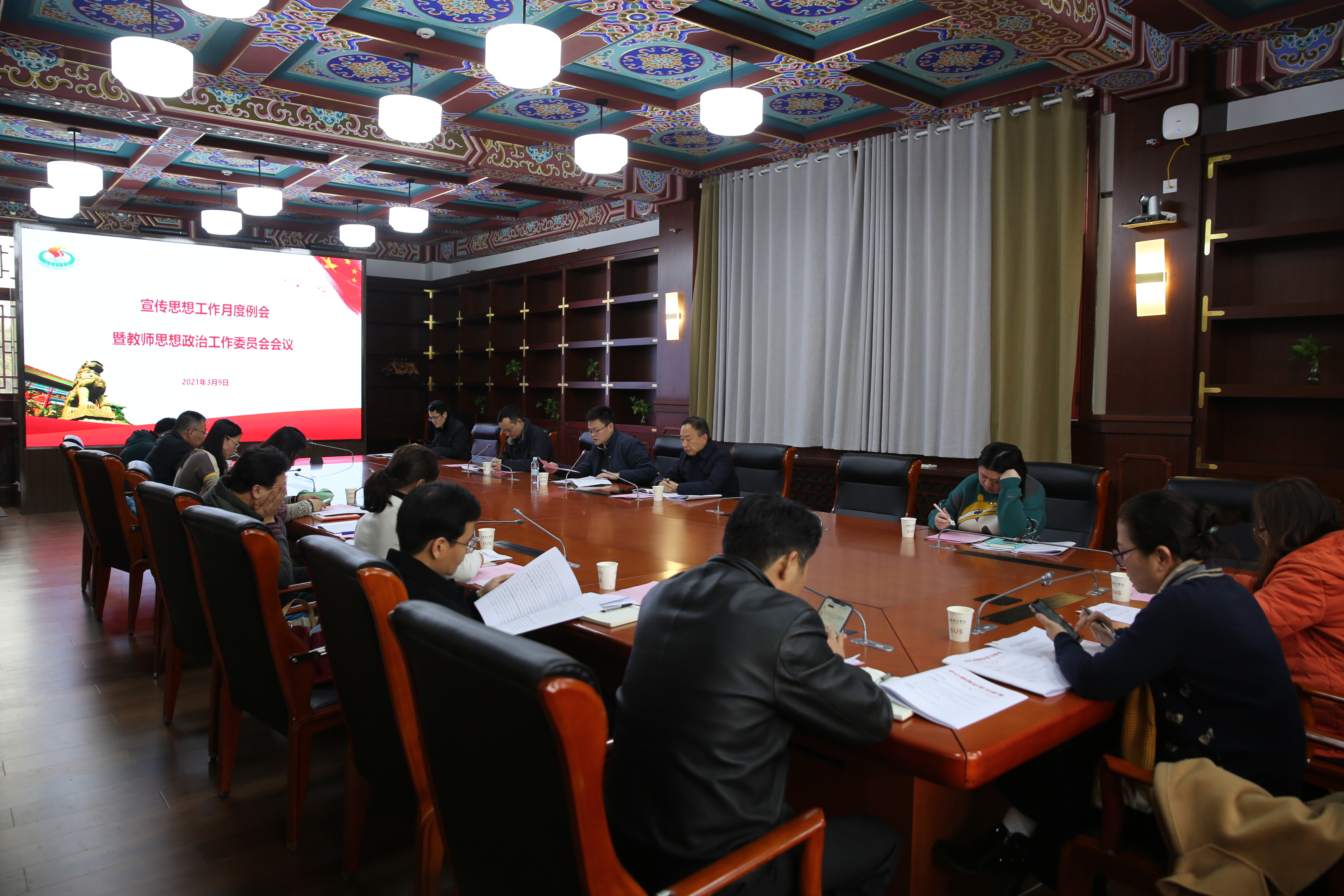 本网讯 3月9日下午,我校宣传思想工作月度例会在绿瓦大楼第四会议室召开。党委副书记潘勤,党委宣传部、教工部、学(研)工部、教务处、国交处、后勤处等部门负责人,二级学院党组织书记参加会议。党委常委、宣传部部长张盛主持会议。党委副书记潘勤就深入学习贯彻习近平总书记在党史学习教育动员大会上的重要讲话精神提出要求。