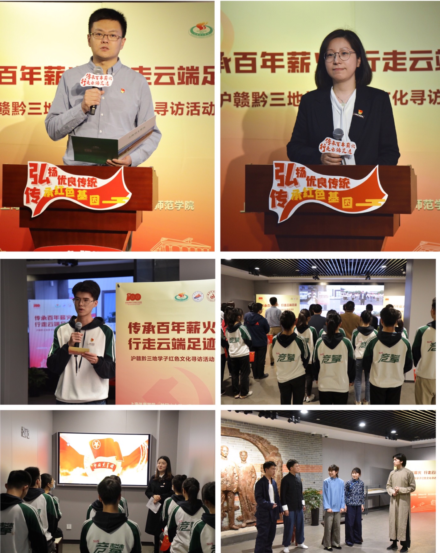 三校在网络直播中共同云游了团中央机关旧址(渔阳里),观看关于渔阳里的微党课与上体师生原创话剧《渔阳烽火》,共同回顾中国共产党在早期奋斗过程中的历程;三校在连线的现场共同唱响《没有共产党就没有新中国》,也共同以上体原创健身操舞演绎了这首歌曲。井冈山大学现场师生共同朗诵了毛泽东诗词《水调歌头·重上井冈山》;遵义师范学院在该校具有红色主题教育特色的红色百年广场开展活动,由辅导员现场宣讲红色故事。