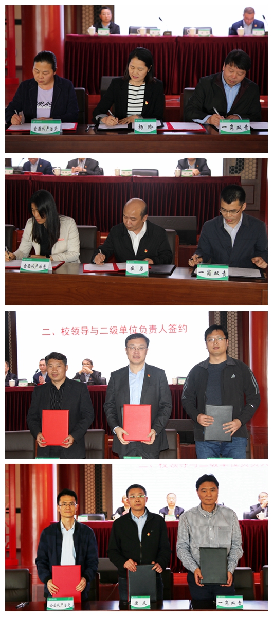 为进一步提高各级党组织和党员领导干部责任意识和主动性,落实全面从严治党工作要求和管党治党的责任闭环,会上校领导与二级党组织负责人和职能部门负责人代表签订了“二级党组织全面从严治党”和“一岗双责”责任书。