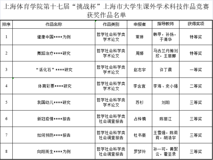 本届竞赛全市近5万名大学生报名参赛,共申报了万余件参赛作品,增幅达6%。经校级初赛评审,共有来自46所高校的492件作品晋级市赛。我校报送的12项作品经过激烈的角逐后,4件作品入围市赛决赛,最终《健康中国****为例》、《舞蹈治疗****研究》2项作品获得上海市特等奖;《“活化石”****研究》获上海市一等奖;《体育彩票****研究》获上海市二等奖。我校获奖作品以独特的体育特色,展现了我校学生的科研水平和团队协作能力,得到了大赛评委的认可。这也是我校聚焦体育学科研究及实践育人的新突破。