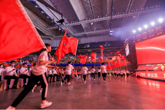 旗手节目组从接到表演邀请到现场表演,只有一周时间准备,来自于运动科学学院、武术学院、经济管理学院及校学生会等单位的近300名旗手分成“红旗表演团”和“各单位(学校)旗帜表演团”,将表演贯穿整场晚会,从开篇的《红旗颂》的有序出场、到尾声的《不忘初心》整体挥动,以及伴随主要节目来营造互动氛围的挥舞,还有观众参与感较强的绕场巨型红旗“永远跟党走”,都来自于我校参演代表热情洋溢的表演。他们虽然不在灯光耀眼的舞台上,但全程活跃于整个东方体育中心场馆内,没有互动环节时就耐心地“隐藏”在观众过道,一有表演就立马扛着红旗鱼贯而入、尽力挥舞,旗杆和旗帜就是青年的责任寄托,笑容和热情就是青年的青春写照。旗手节目组的表演可能没有独占几分钟的台上亮相,但为整场近100分钟的节目营造热络而昂扬的现场气氛。