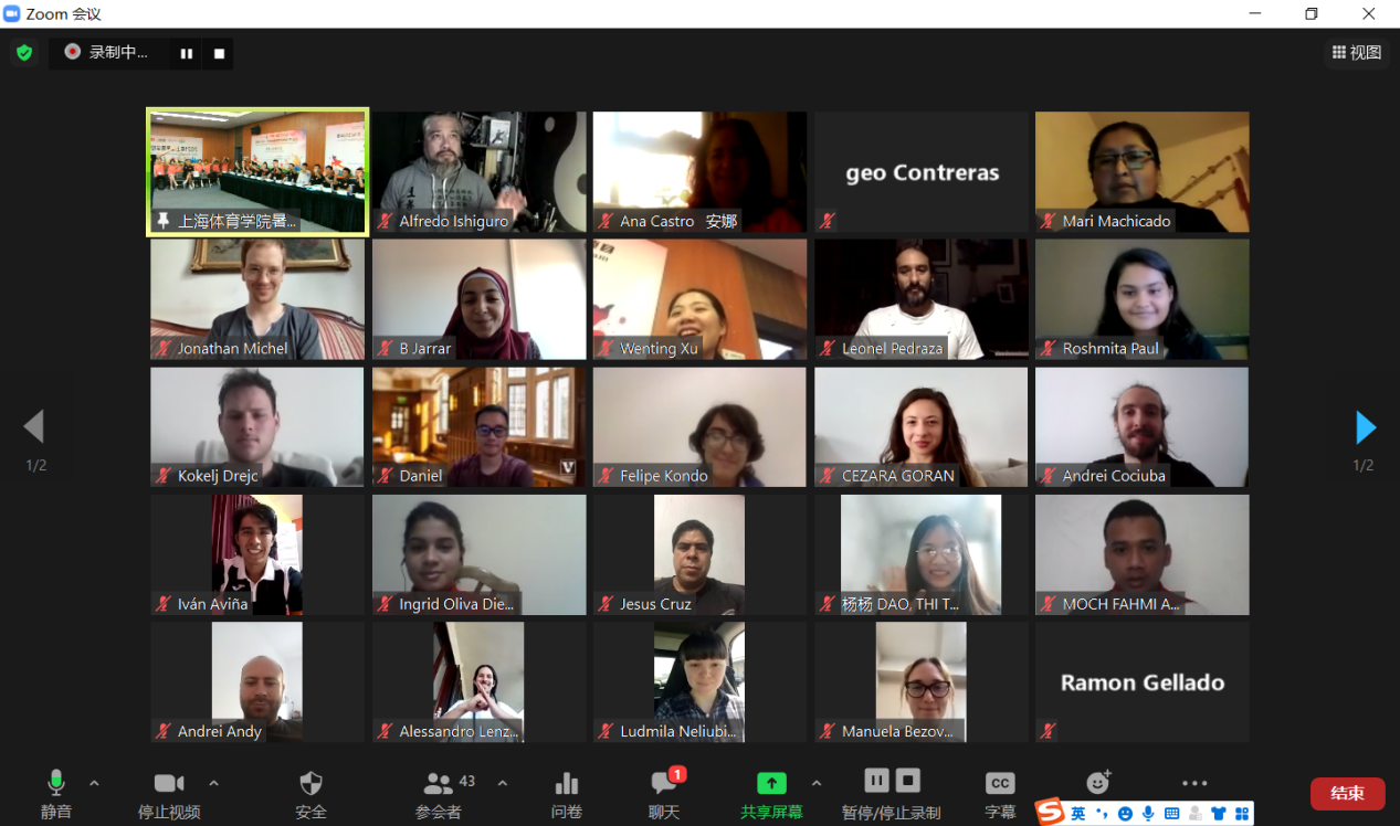 “远隔千里,近在眼前”,暑期学校的三位海外学员代表向大家送上了云端问候。来自瑞士的武术教练Ben Mahnoud Sami向大家分享了自己在瑞士经营武术馆的情况,展示了当地居民,从幼儿到成年人如何参与武术训练和备战比赛。来自葡萄牙的梅芳向大家分享了疫情期间,她和她的学生居家期间如火如荼的武术训练场面;来自斯洛文尼亚的Manuela Bezovnik分享了自己对乒乓的执著和对此次项目的期待。学员们身处不同国家,却通过这种连线方式相聚在一起,倍感亲切。