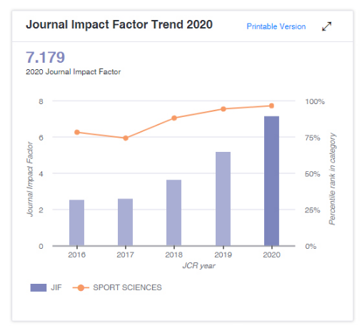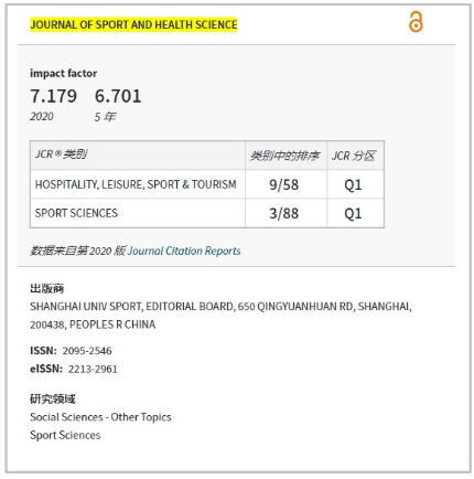 本网讯 北京时间2021年6月30日,在中国共产党即将迎来百年华诞之时,从科睿唯安(Clarivate Analytics)传来喜讯,据《期刊引证报告》(JCR)最新数据,我校主办的《运动与健康科学(英文)》(Journal of Sport and Health Science)继续保持增长态势,2020年影响因子跃升至7.179(去年为5.2),总被引频次达到2746(去年为1562),学科排名亦大幅提高:在88种被SCI收录的体育类期刊中排名第3(去年排名第5),位于Q1。