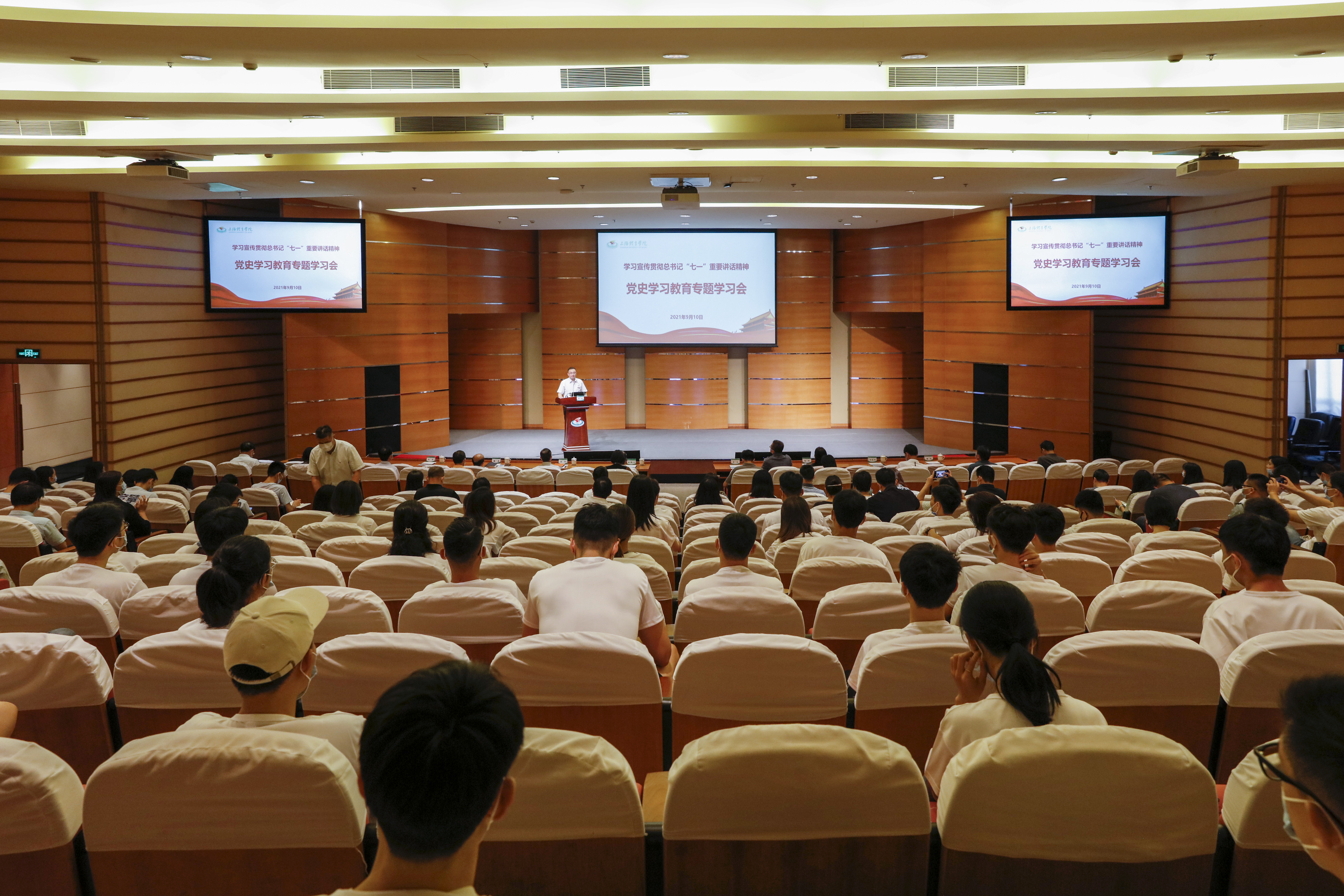 本网讯 9月10日下午,新学期第一场党史学习教育专题学习会在图文信息楼报告厅举行。中共一大纪念馆党委书记、馆长、上海市委党史学习教育专家宣讲团成员薛峰受邀讲课。党委中心组(扩大)成员、新入职教师代表、宣讲团成员、新生代表参加学习。会议由校党委书记李崟主持。