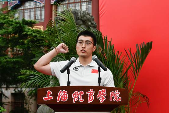 在校生代表、国家击剑队奥运科技服务项目团队成员、运动科学学院研究生施宇铭作为老生代表发言并领誓。他讲述了在东京奥运会重剑项目中的科研工作经历,亲身体会到上体人用实际行动诠释“身心一统,兼蓄竞攀”的校训,而自己也一路收获着成长和感动。