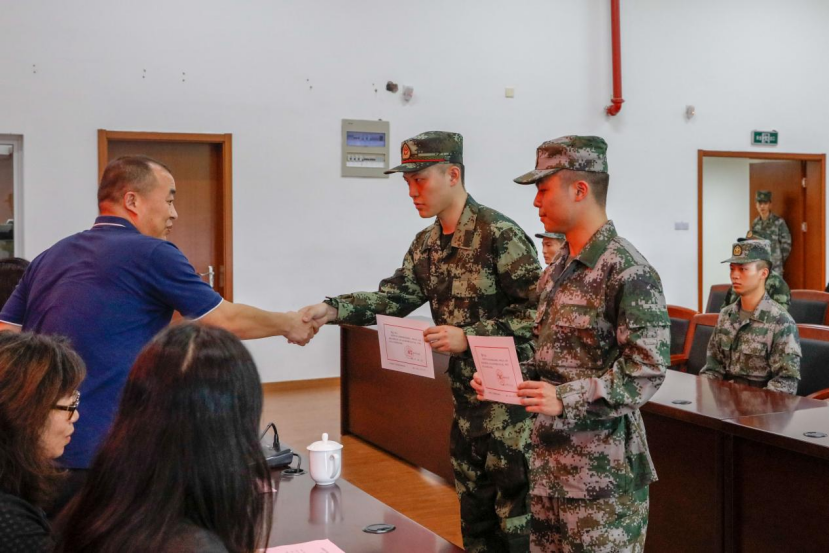 王继红首先对入伍新兵表示了祝贺,对学生们参军入伍报名的积极态度和昂扬的精神面貌给予了肯定。他寄语入伍学生们应当将满腔的爱国热血投入到未来的军事训练和作风养成中去,勇于克服困难、战胜自我,以优异的成绩为母校增光添彩,最后王继红和各学院领导为正式定兵入伍学生发了入伍通知书。