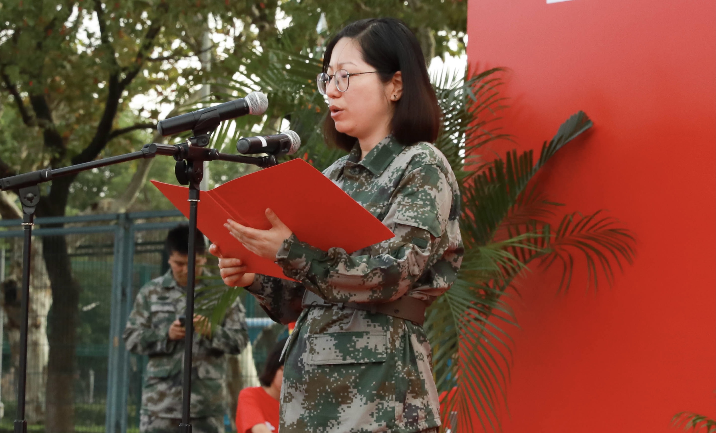 来自体育教育训练学院的新生代表陈玲蓓同学表达了对军训的美好憧憬,并代表新生表态:必定秉承“身心一统,兼蓄竞攀”的校训,以昂扬的斗志,将以饱满的热情投入到军训中,展现出绿瓦学子奋发向上的精神风貌和青春活力。