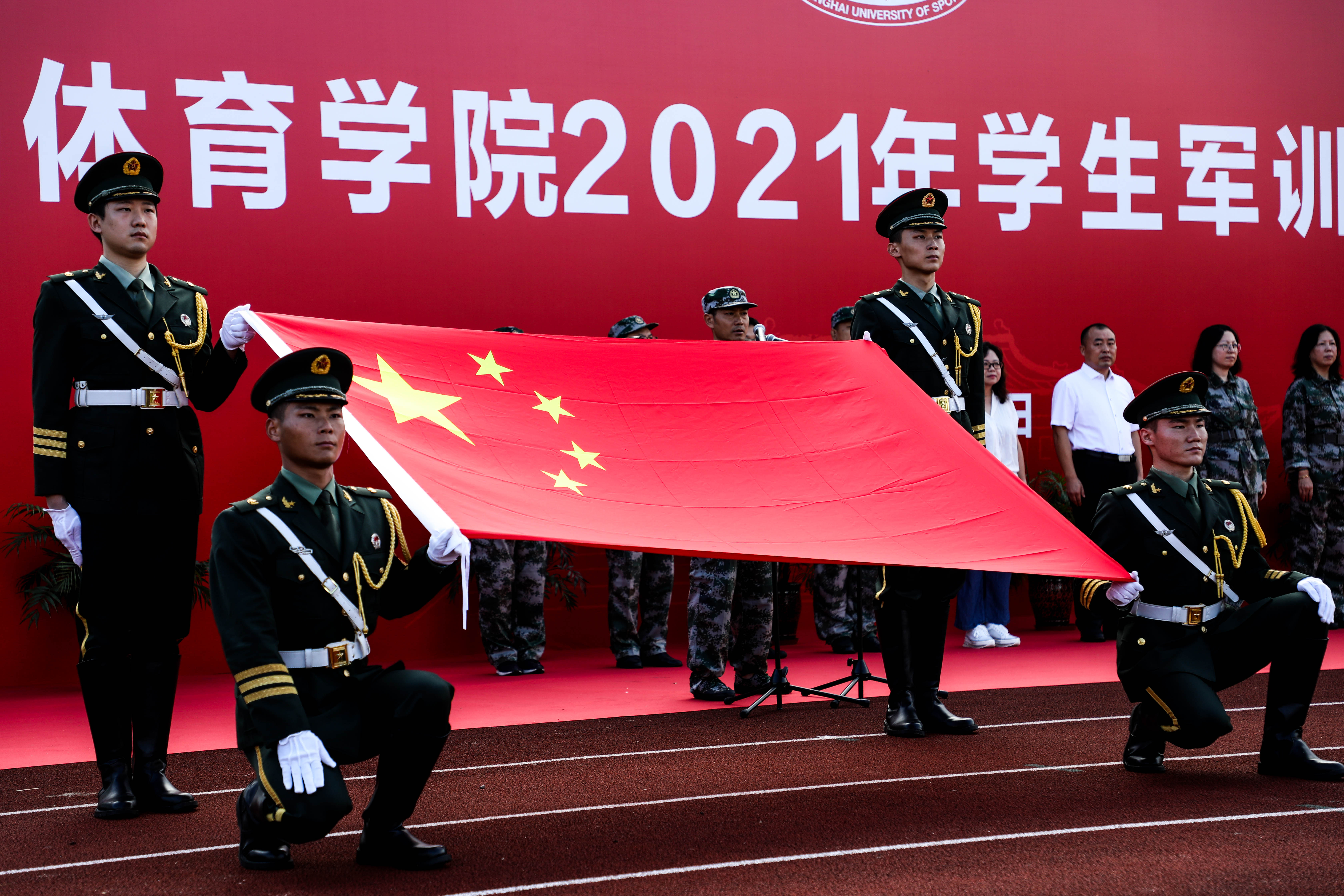 本网讯 10月10日上午,上海体育学院2021年学生军训开营仪式在西田径场举行,2021级全体新生迎来了大学生涯第一堂实践课——军训。
