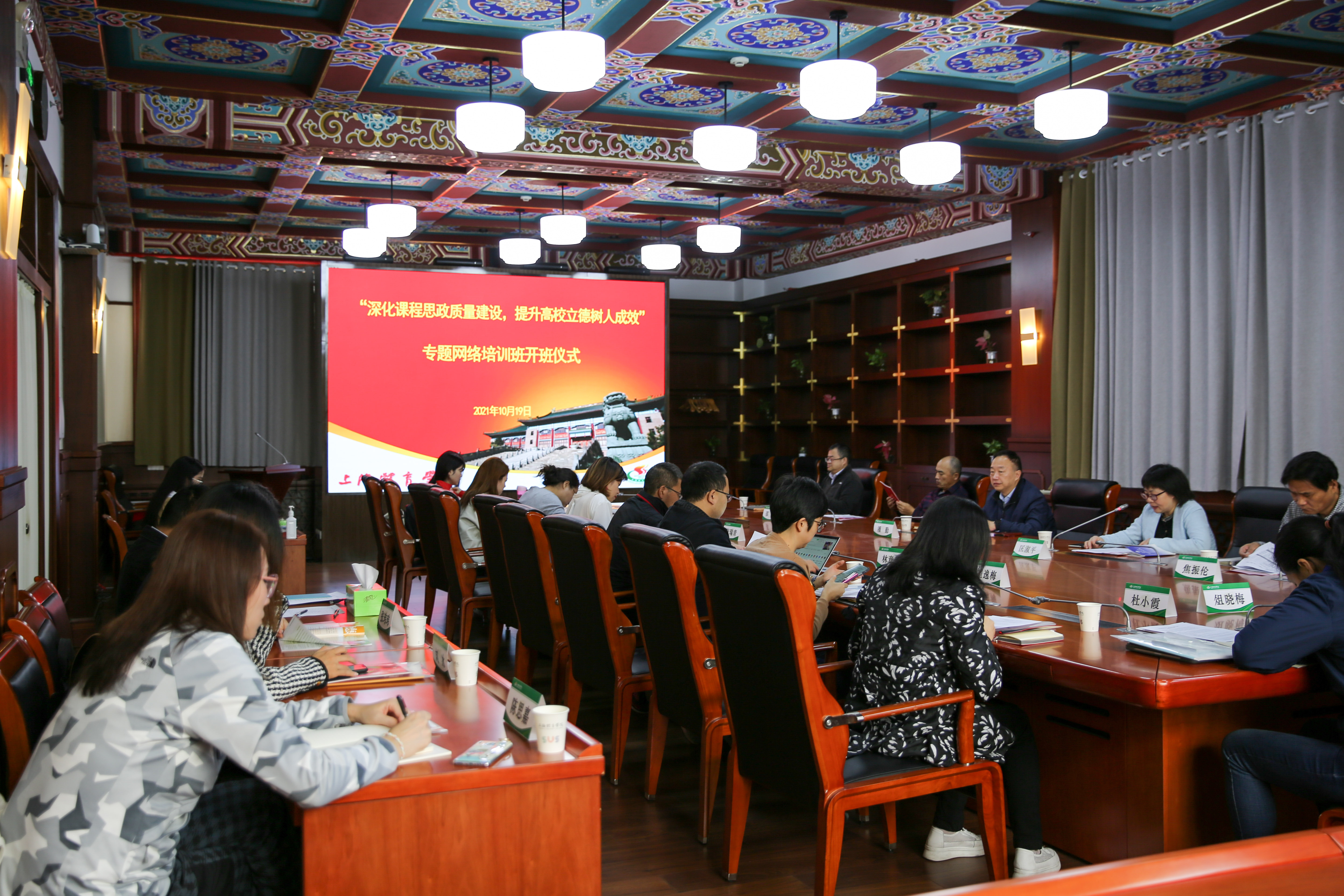 本网讯 10月19日,2021年度师德师风网络专题培训开班仪式在绿瓦大楼第四会议室举行。本期培训以“深化课程思政质量建设,提升高校立德树人成效”为主题,依托国家教育行政学院中国教育干部网络学院进行培训。党委副书记潘勤出席仪式并讲话,党委教师工作部部长匡淑平、人事处处长焦振伦、教务处处长邵斌、研究生处副处长王琳和各二级单位参训教师代表参加。教工部部长匡淑平主持开班仪式。
