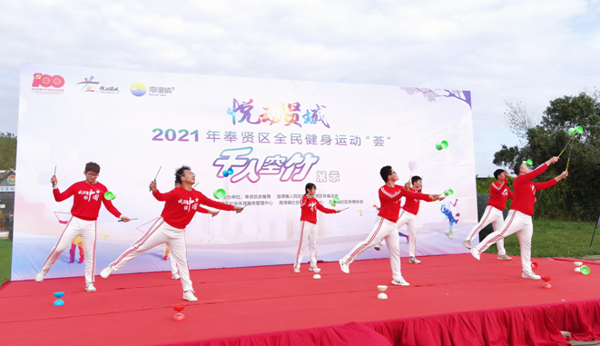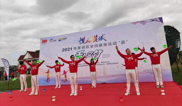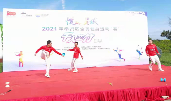 本网讯 10月17日上午,位于奉贤区海湾镇上海“都市菜园”外的广场上热闹非凡,奉贤区社会体育中心在这里特别举办“悦动贤城”2021年奉贤区全民健身“荟”千人空竹展示活动,我校空竹社及民间体育专项班在内的十名同学在休闲学院杨小凤教师的带领下受邀参加了此次展示的开幕式表演及展示环节。
