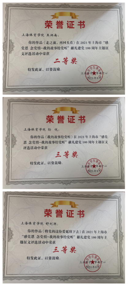 我校学(研)工部积极组织学生参与,经学生投稿、专家评审、学校推荐后报送上海市学生事务中心参赛,最终我校18级体育教育训练学院研究生王炳南获二等奖、19级武术学院本科生孙悦获三等奖、20级传媒与艺术学院研究生舒刘洪获三等奖。我校在此次征文比赛中精心组织、大力宣传、积极报送,获优秀组织奖。