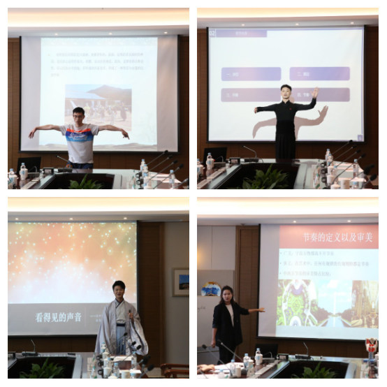 教学展示和竞赛由教学设计、课堂教学和教学反思三部分组成,参赛教师现场抽取展示顺序,蔡东燐老师以“中国少数民族文化传承”、孙正昊老师以“华尔兹舞基本步的教学”、邵绿老师以“电视画面编辑——动接动之第一节”、张帆老师以“拟态环境理论”、尹如歌老师以“看得见的声音——以中华传统武艺为呈现形式的语音与发声关键问题诠释”、李丁老师以“社交媒体的前世今生”、路珏老师以“Race and Racism in English Sports Reports”、吴仁塔娜老师以“舞蹈音乐的节奏”为主题作了展示。