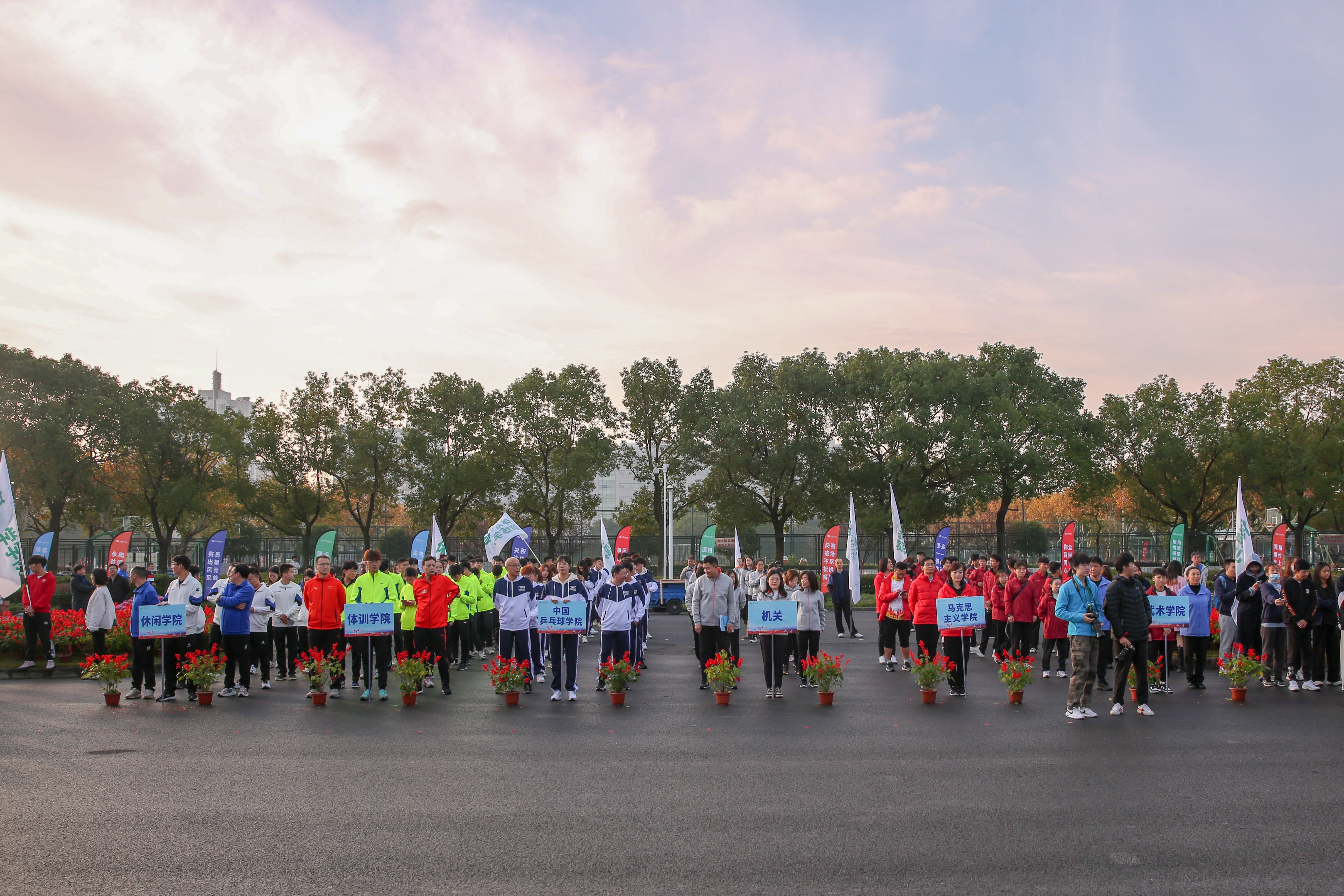 在开幕式环节前,中国乒乓球学院代表队、机关代表队、后勤服务中心代表队和运科学院代表队等十四支队伍,昂首挺胸地整齐站立,接受校领导检阅。