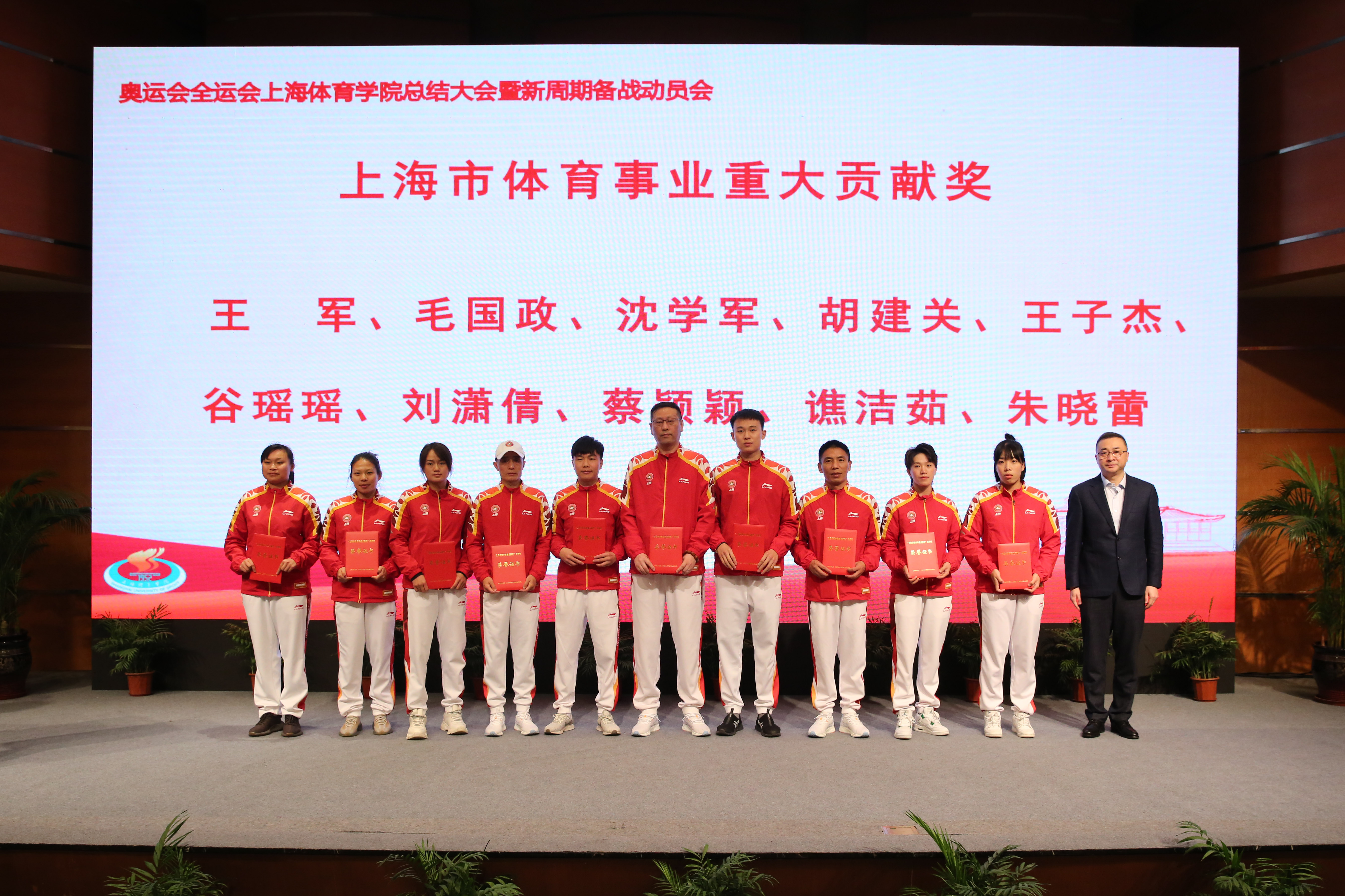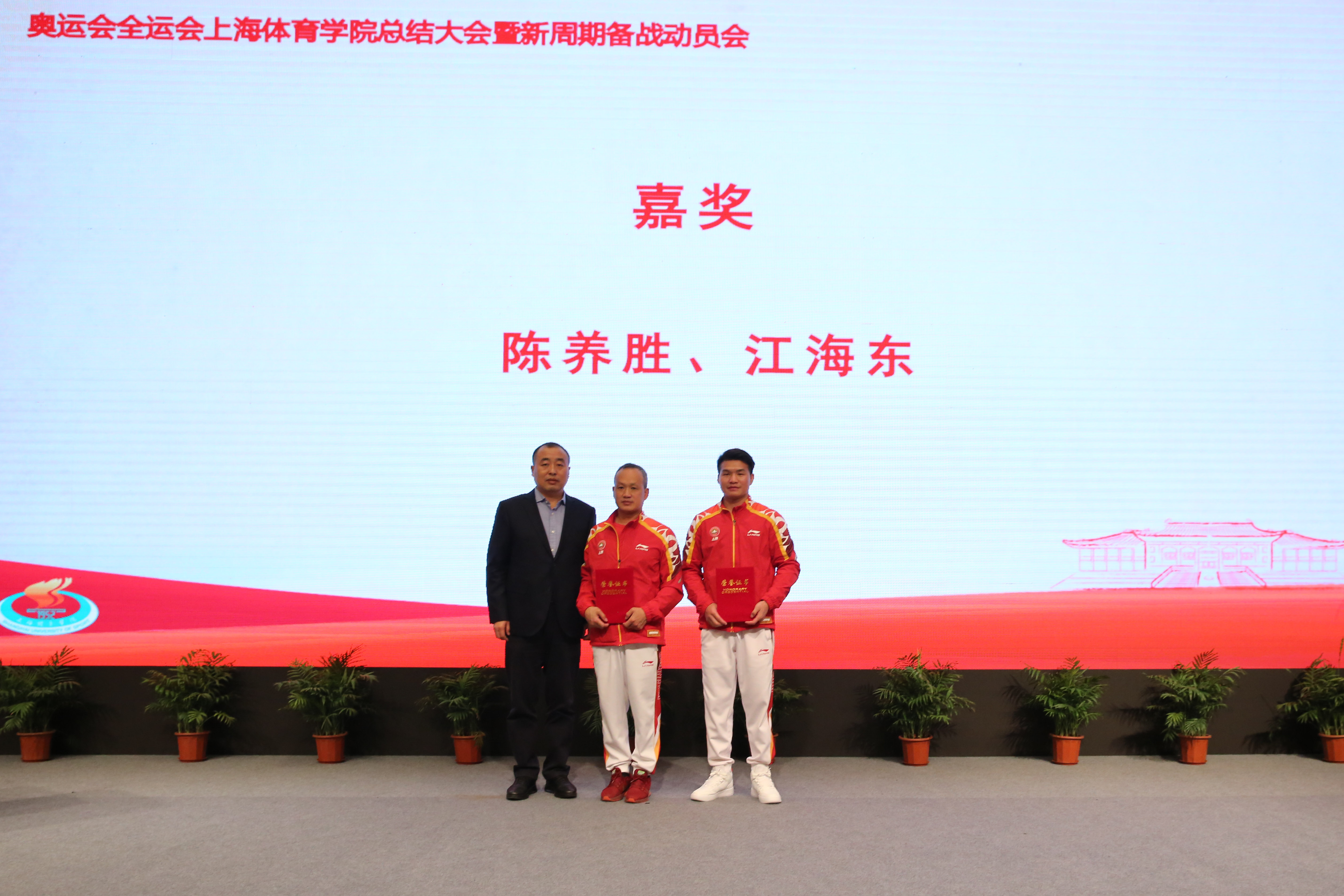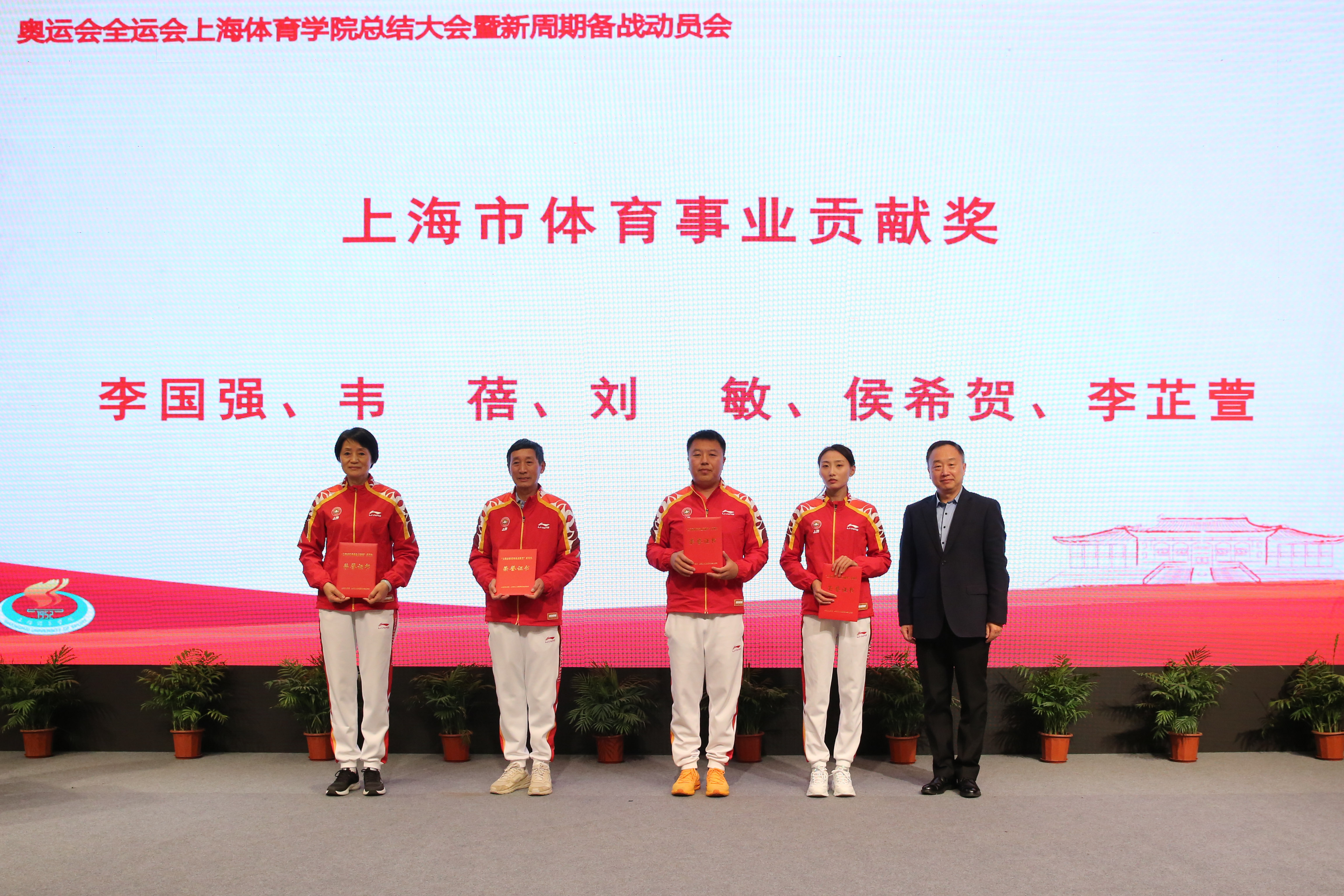 校党委书记李崟,党委副书记潘勤,党委副书记、副院长王继红分别为获得上海市体育事业重大贡献奖、上海市体育事业贡献奖、上海体育学院体育事业嘉奖人员颁发荣誉证书。副院长唐炎宣读表彰决定对奥运会全运会成绩突出的教练员、运动员、医科保障人员、行政人员分别进行了表彰。