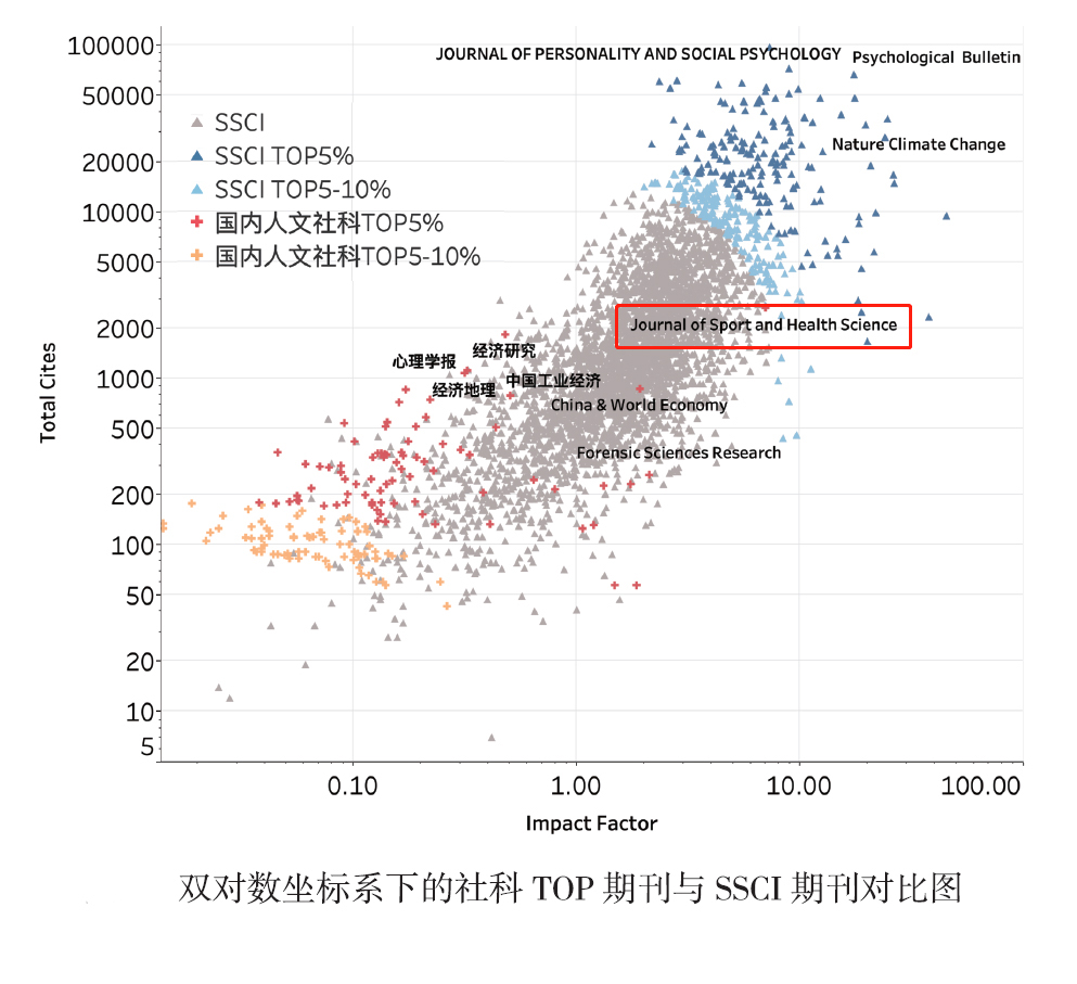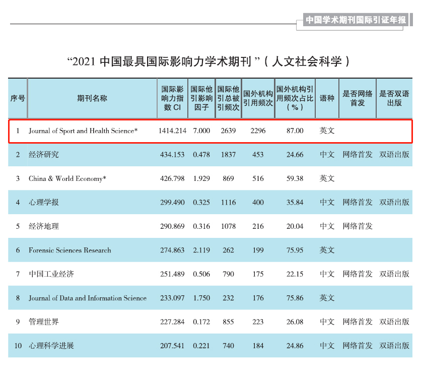 《年报》依据他引总被引频次(TC)、他引影响因子(IF)和影响力指数(CI)等重要的期刊评价指标遴选排名TOP5%的期刊为“中国最具国际影响力学术期刊”。在人文社会科学领域,共有80种期刊入选“中国最具国际影响力学术期刊”,JSHS 以1414.214高分(CI)排名第一。《年报》“5.1 TOP期刊与SSCI期刊对比分析”(P19)中将遴选出的160种期刊(含80种“中国国际影响力优秀学术期刊”)与WOS发布的2020年JCR报告中3000余种SSCI期刊一起,计算各刊的影响力指数CI并进行对比分析,结果显示“Journal of Sport and Health Science已达SSCI期刊TOP水平,整体表现优于去年,进一步稳固了国际一流期刊的位置”(摘自《年报》原文)。