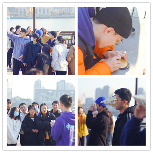 漫步杨浦滨江,心理学院19级与20级团支部创新教育形式,沉浸式开展团建活动,任务设计包含了党史四词你画我猜等游戏环节,在沉浸式学习中,重温中国共产党百年来的伟大成就。团建活动伊始,两个团支部学生随机分成了五组,各组取好队名、口号之后合影一张,各组轮流上台喊出自己的队名和口号,富有创意的口号队名收到了大家的笑容。你画我猜小游戏里,各队选取出代表,上前进行比划。