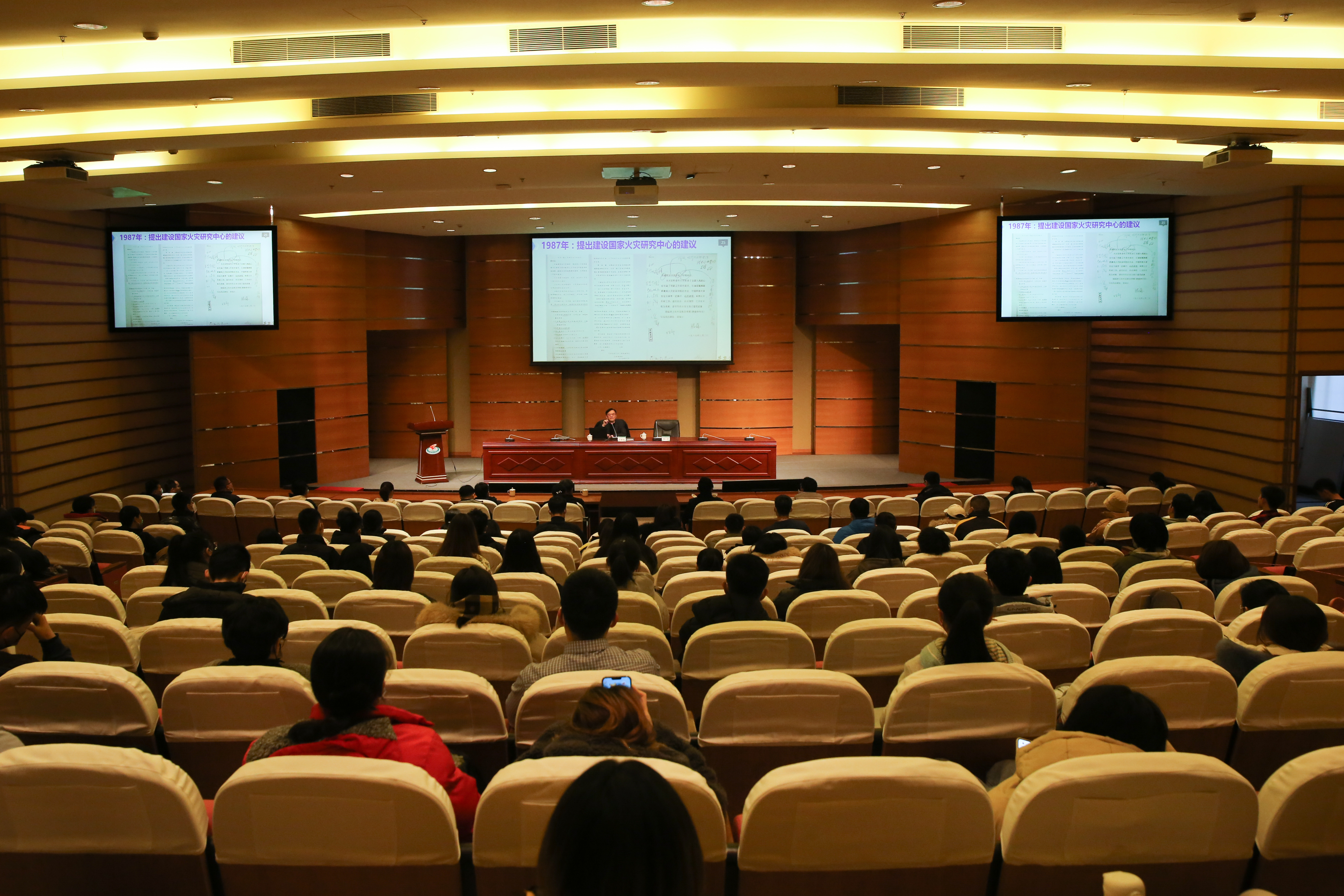 范维澄院士以精彩的图文、生动的语言,首先向在场师生介绍了自己的专业背景和求学经历是将自身的学术专长与社会发展紧密相连。随后,范院士深入浅出地了我国火灾科学的发展历程及应用,清晰阐述了其学术意义与应用价值。在此基础上,范院士结合新世纪以来国际、国内发生的若干重大公共安全事件,强调了公共安全研究对于国家长治久安,国民经济健康发展的重要作用,描绘出“公共安全”作为一门独立学科的广阔发展前景和重大现实作用。最后,范院士与师生亲切分享了自己的学术经历与心得体会,强调了“快乐科研”的重要性,勉励在场师生立足本职,不负韶华。整场讲座旁征博引、内容丰富、生动风趣,获得现场阵阵掌声。