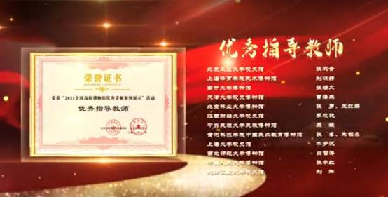 “2021年全国高校博物馆优秀讲解案例推介展示活动”从2021年10月启动后,共有全国各地64家高校博物馆参赛,作品规模和参赛质量都创历届新高,经过选手的激烈角逐和专家认真、客观、公正的评选,63部讲解作品分别荣获一、二、三等奖,另外还有14位高校博物馆教师获得优秀指导教师奖。