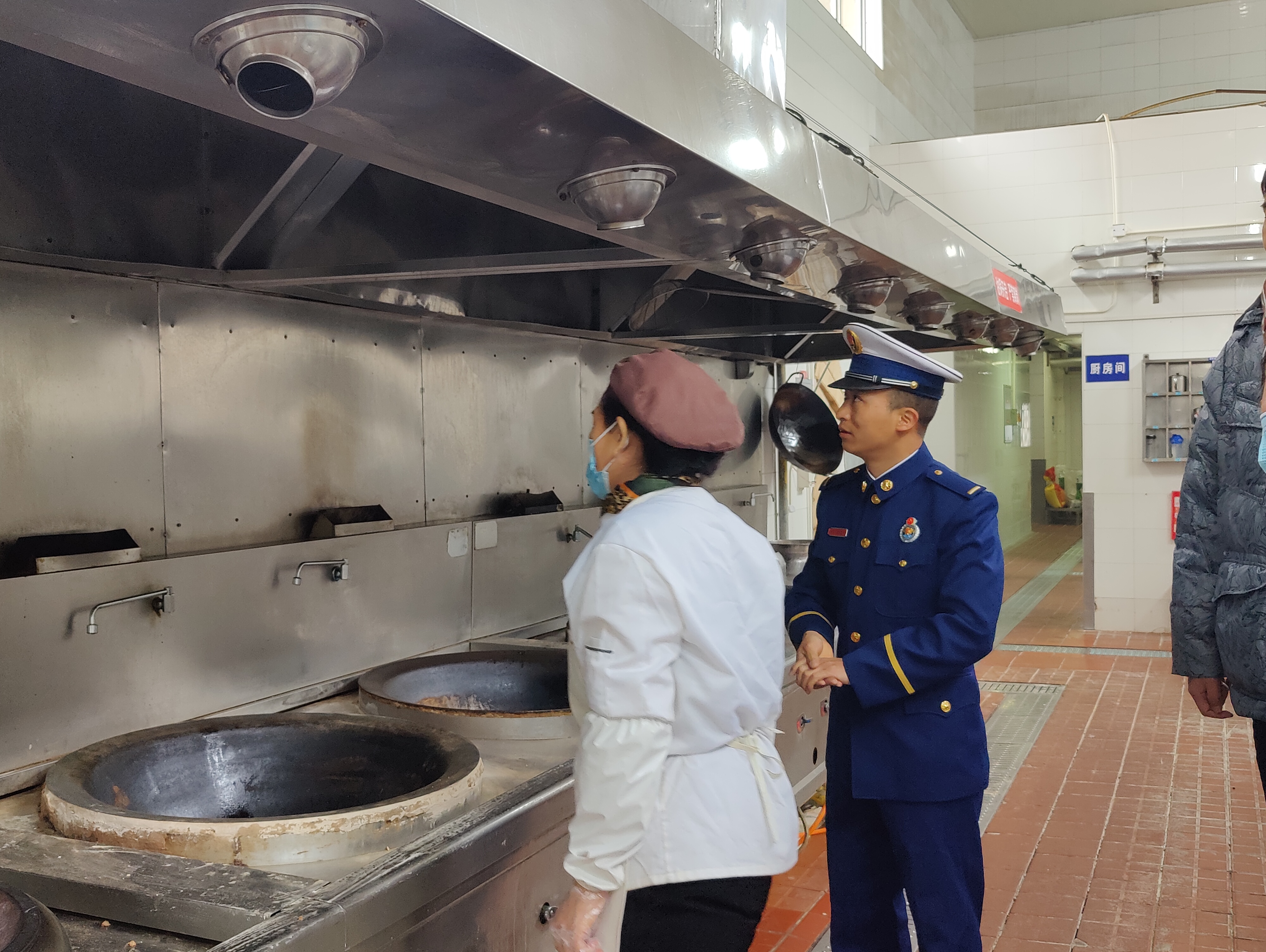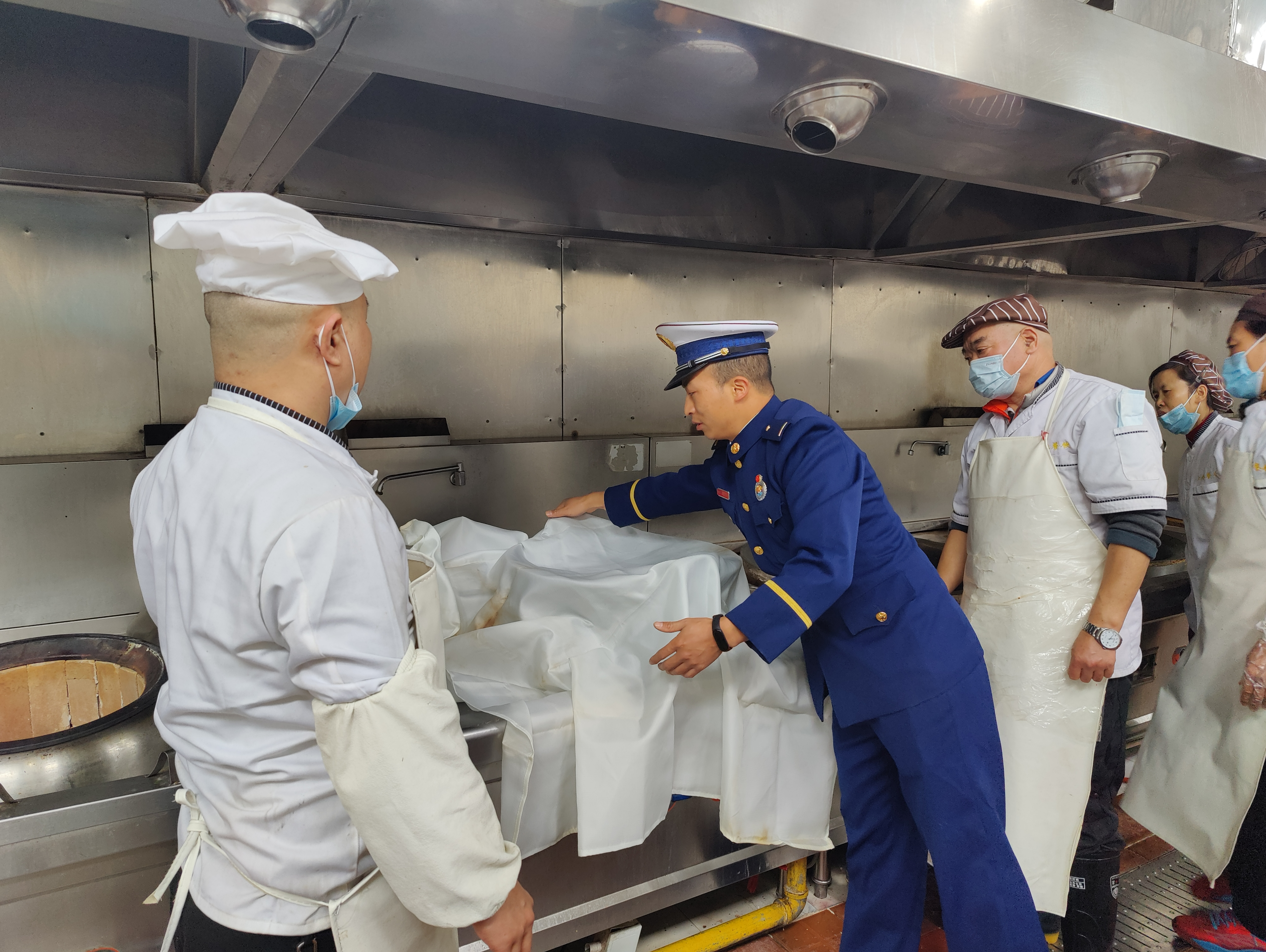 随后消防救援中心的教导员为餐厅员工科普了厨房中引起的消防安全隐患,并讲解和展示了消防灭火毯的正确使用方法,同时也模拟了油锅着火的情况下如何应急处理和灭火的方法。最后在教导员的指导下,让餐厅员工们体会灭火毯的使用。