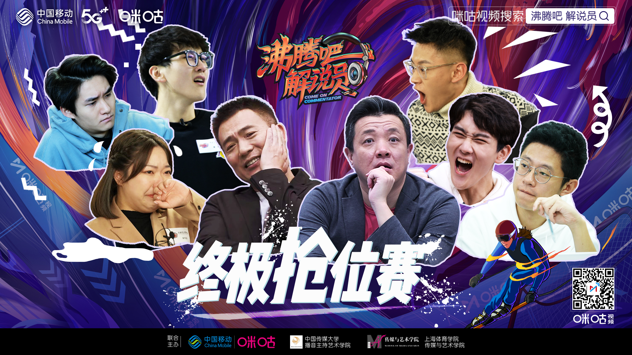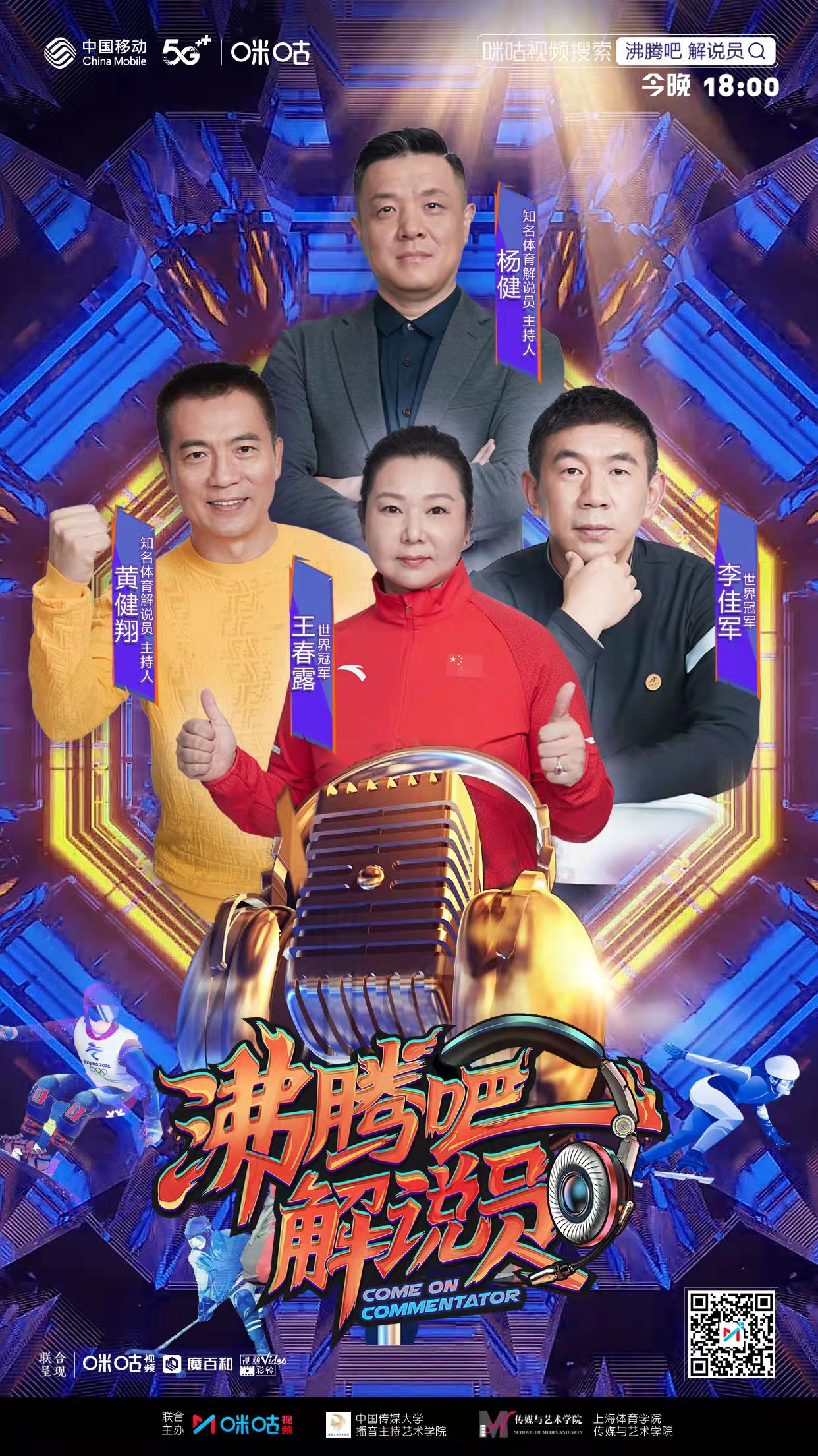 《沸腾吧!解说员》由咪咕视频发起,联合“中国播音、主持摇篮”中国传媒大学和“体育记者、解说摇篮”上海体育学院共同主办,采用冬奥7个大项“对抗解说”的比赛方式,旨在为北京冬奥这一全球顶级赛事挖掘“专业、担当、青春、热血”的解说新声音。