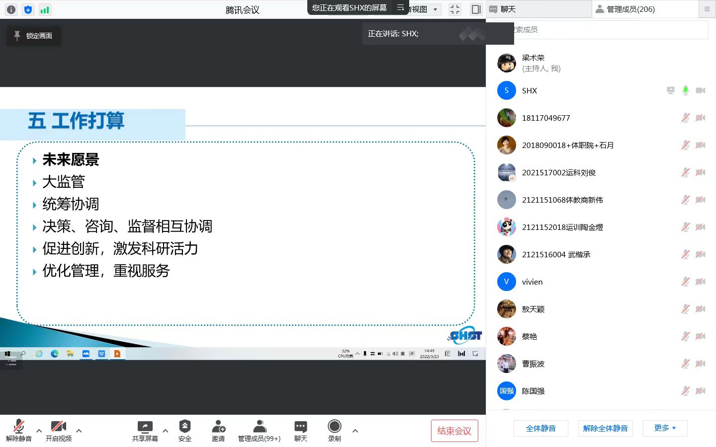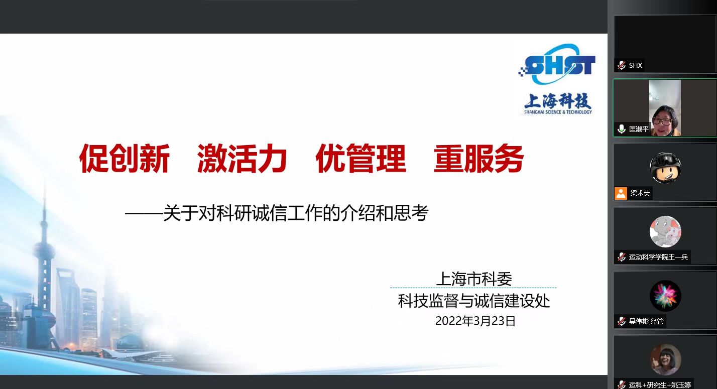 本网讯 3月23日下午,科研处、研究生处和党委教师工作部三部门联合举行2022年教师、研究生科研能力培训暨“崇德修身”教师沙龙活动。受疫情影响,活动通过腾讯会议平台线上方式进行,特别邀请上海市科委科技监督与诚信建设处处长斯海雄作《促创新,激活力,优管理,重服务——关于对科研诚信工作的介绍和一些思考》专题辅导报告。党委副书记潘勤、副院长唐炎出席活动,党委教师工作部部长、机关党委书记匡淑平,科研处处长曹振波,研究生处处长刘东锋、副处长王琳,科研处技术转移中心董淼军和各二级学院200余名教师、研究生代表参加活动。活动由匡淑平主持。