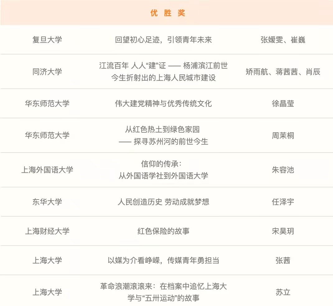来自全市29所高校70余门优秀微课程作品围绕党史学习、弘扬伟大建党精神、脱贫攻坚、上海红色历史等主题,结合各校红色基因、专业特色等,并融合了演讲、音乐表演、舞蹈展示等丰富的形式,展现了上海青年学子对于党的历史的深入学习、深刻思考,并通过通俗易懂、喜闻乐见的形式转化为“飞入寻常百姓家”的理论宣讲课程。