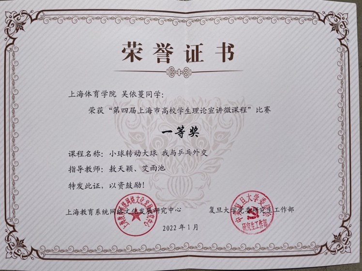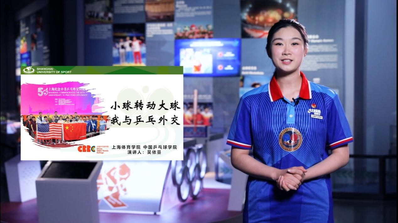 我校中国乒乓球学院的吴依蔓同学凭借《小球转动大球,我与乒乓外交》荣获一等奖。