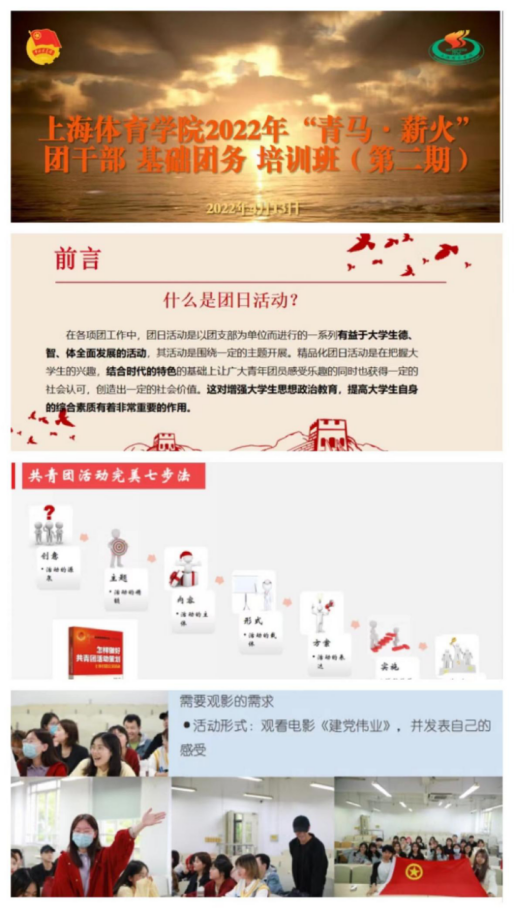 为了提升因线上直播而“打折扣”的培训有效性,本次培训除了强化培训主题日当天的课程结构升级,还在“预习”和“复习”板块做了较为充分的准备。课前准备了共青团中央基础团务培训系列学习资料,每节课后还分享了培训课程考评电子问卷,结合团支书们关于“提供可推广的团学活动模版、团务培训实录视频、细化团体活动步骤”等建议及问题,在第二期主题培训日开展过程中得到修正及解决,两期活动最后一并发布了我校创建2022活力团支部的通知及各团支部开展“喜迎二十大、永远跟党走、奋进新征程”主题团日活动的实施方案,趁热打铁,在建团100周年即将来临之际做好线上氛围预热和组织化准备工作。