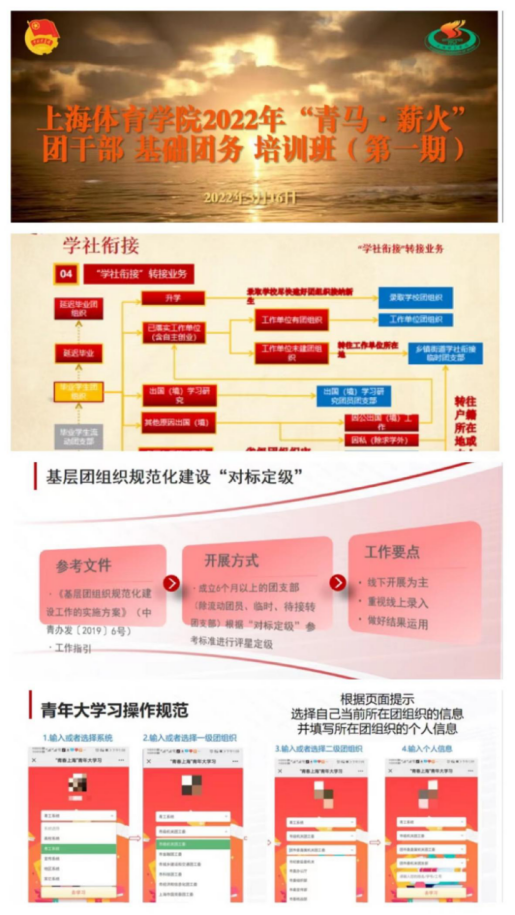 近日,为突出“喜迎二十大、永远跟党走、奋进新征程”主题教育实践活动特色,胜利迎接建团100周年,在确保疫情防控安全的前提下,我校“青马 薪火”团干部基础团务培训班在线上完成培训,累计参训人数403人次,覆盖各学院团委委员、各年级团支书。培训分为两天,主题对应“基础团务培训日”和“主题团日活动培训日”。