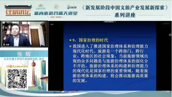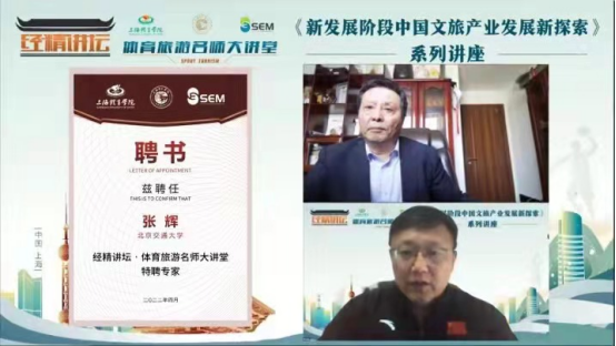本网讯 4月23日下午,经济管理学院“经精讲坛•体育旅游名师大讲堂”新发展阶段中国文旅产业发展新探索系列讲座第二讲顺利举行。国家文化和旅游部“十四五”规划专家委员会委员、北京市旅游学会常务副会长、北京交通大学张辉教授担任本次主讲专家,本次直播共吸引了1000多人次观看。讲座由经济管理学院院长李海主持,随后为其颁发了体育旅游名师大讲堂特聘专家证书。