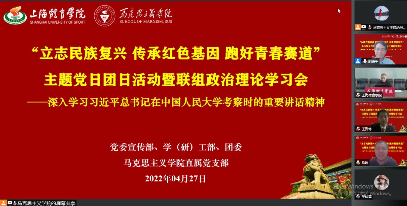 本网讯 近日,习近平总书记考察中国人民大学时的重要讲话在我校引起热烈反响。为深入学习贯彻讲话精神,4月27日下午,马克思主义学院直属党支部联合党委宣传部、学(研)工部、团委,以“立志民族复兴 传承红色基因 跑好青春赛道”为主题,开展主题党日团日活动暨联组政治理论学习会,全体思政课教师与竞攀班学员联组学习习近平总书记考察中国人民大学时的重要讲话精神。党委书记李崟与师生一起开展学习并讲话。李崟代表学校党委,向全校青年学生致以节日的祝贺,向近期奋战在抗疫一线的师生员工表示诚挚的慰问!