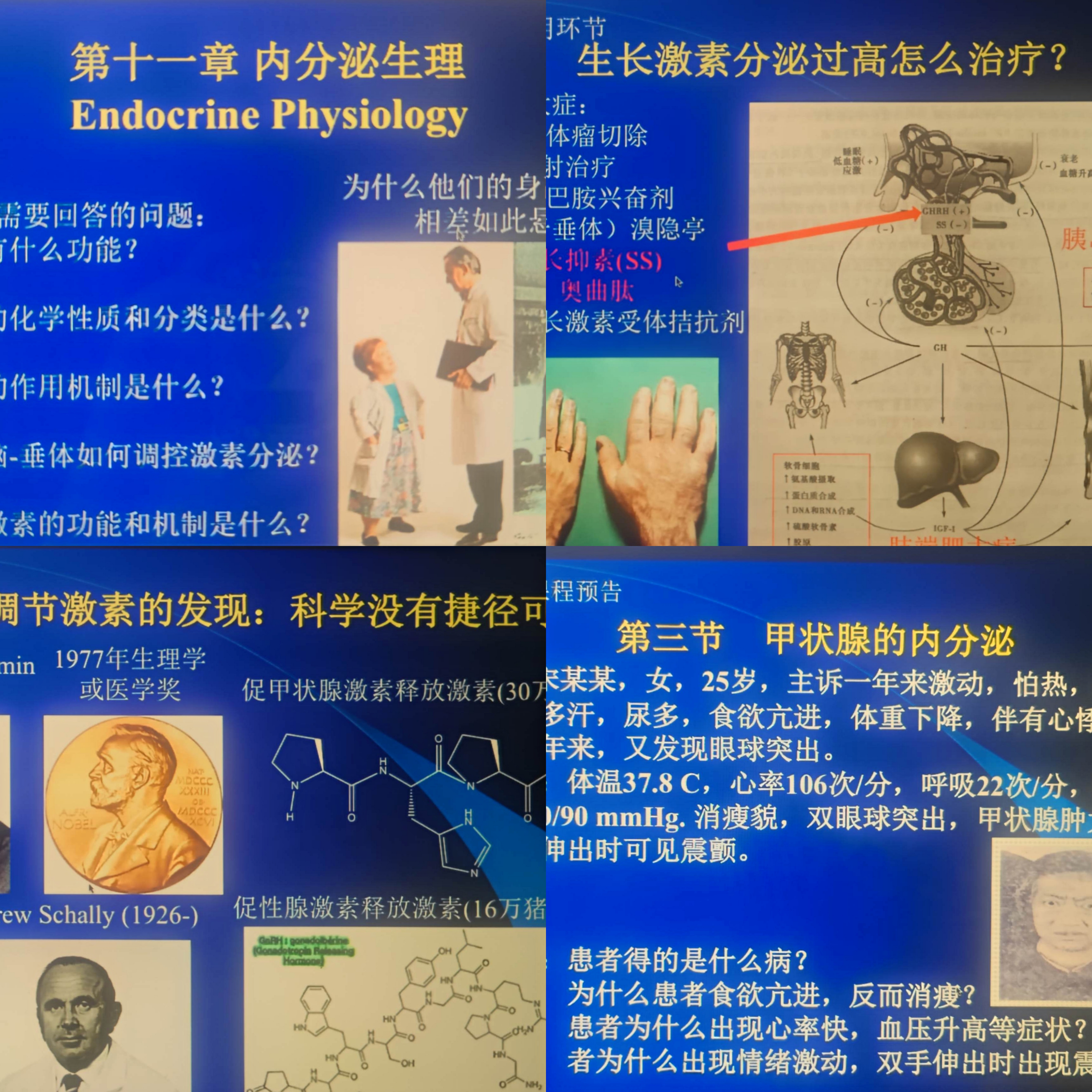 本次课程教学的主要内容为内分泌生理,在两个课时的授课中,王一兵老师首先对上次课程讲授的“激素、外分泌和内分泌”等重点知识进行梳理,以“侏儒症患者和正常人的身高相差为何如此悬殊”来引入本次课程主要内容,着重讲授了激素、内分泌的概念、激素的传递方式、激素作用的特性和激素的调控及作用机制等内容。