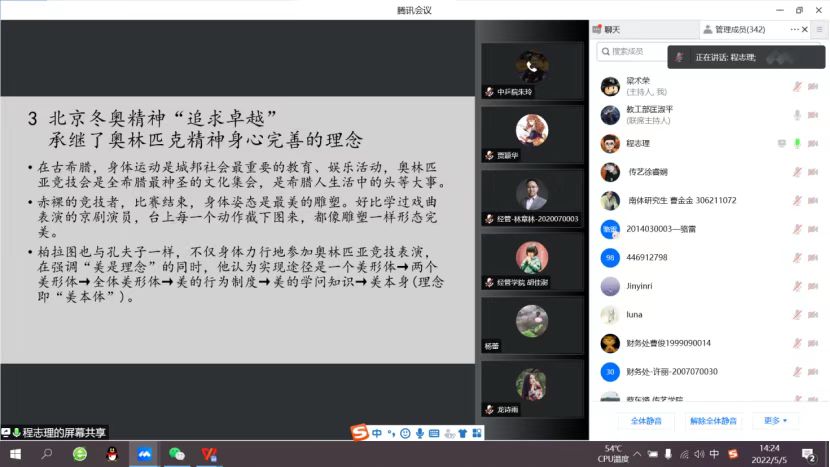 专题学习第一阶段,程志理主编做了题为《新时代的精神召唤——北京冬奥精神的多元阐释》报告。程志理从哲学、史学、文化学等学科视角出发,围绕北京冬奥精神是民族的凝聚力、北京冬奥精神与国民思想政治教育的互构、北京冬奥精神“追求卓越”承继了奥林匹克精神身心完善的理念、北京冬奥精神深刻地揭示了奥林匹克运动文化庆典的内涵、北京冬奥精神与奥林匹克新格言的内在一致性等一系列问题对北京冬奥精神进行了多元阐释。他指出,看似相隔两极的体育运动和哲思精神在社会发展的现实世界里,最形而下的身体运动中,充溢着最形而上的高远玄思,两极原本相通,北京冬奥精神是身心合一精神灌注的信念。他最后强调,北京冬奥精神是新时代中国人的奋斗目标,尽善尽美的人生准则,也是中国梦的明晰化表述。北京冬奥会口号“一起向未来”映照了国际奥林匹克运动“更团结”的新格言,是中国人对奥林匹克主义的贡献。体育运动是国之重器,代表着文化正统。世界不能没有体育运动,体育运动为世界树立文化存在。