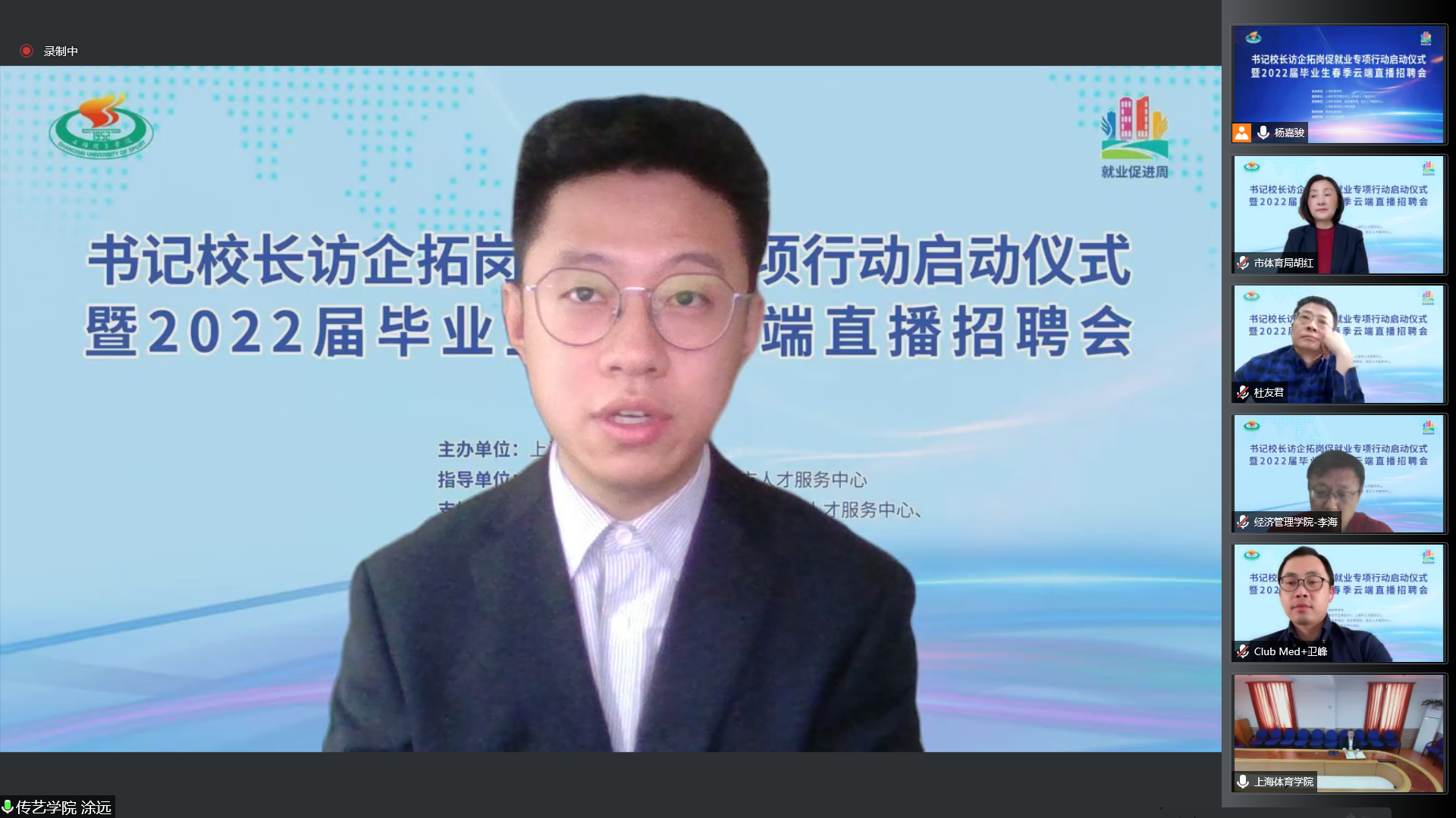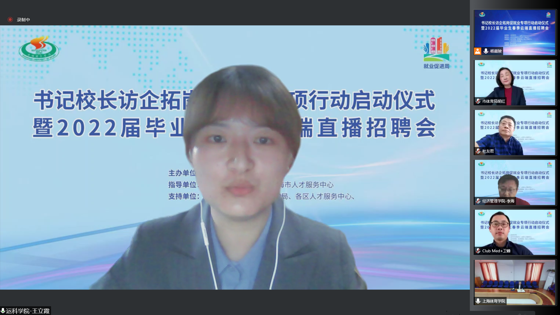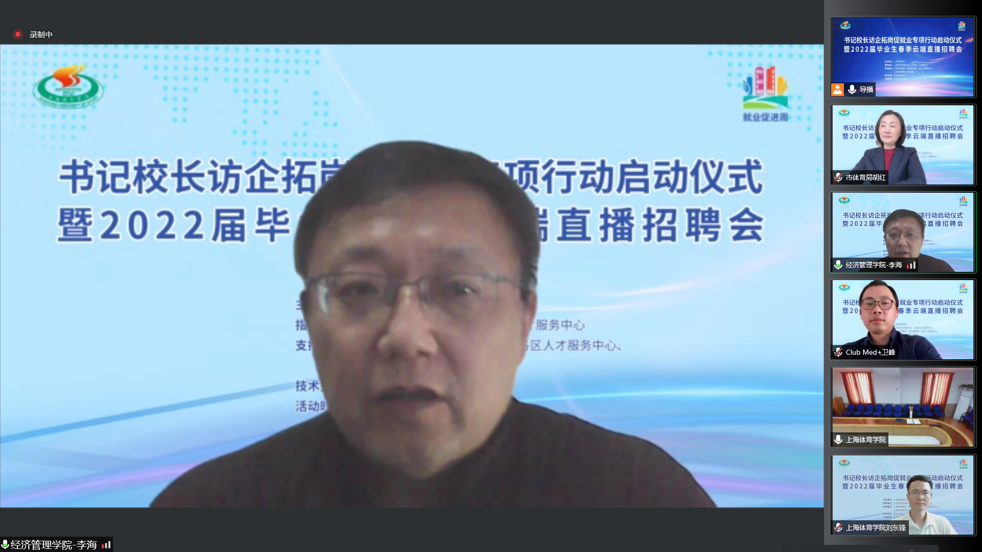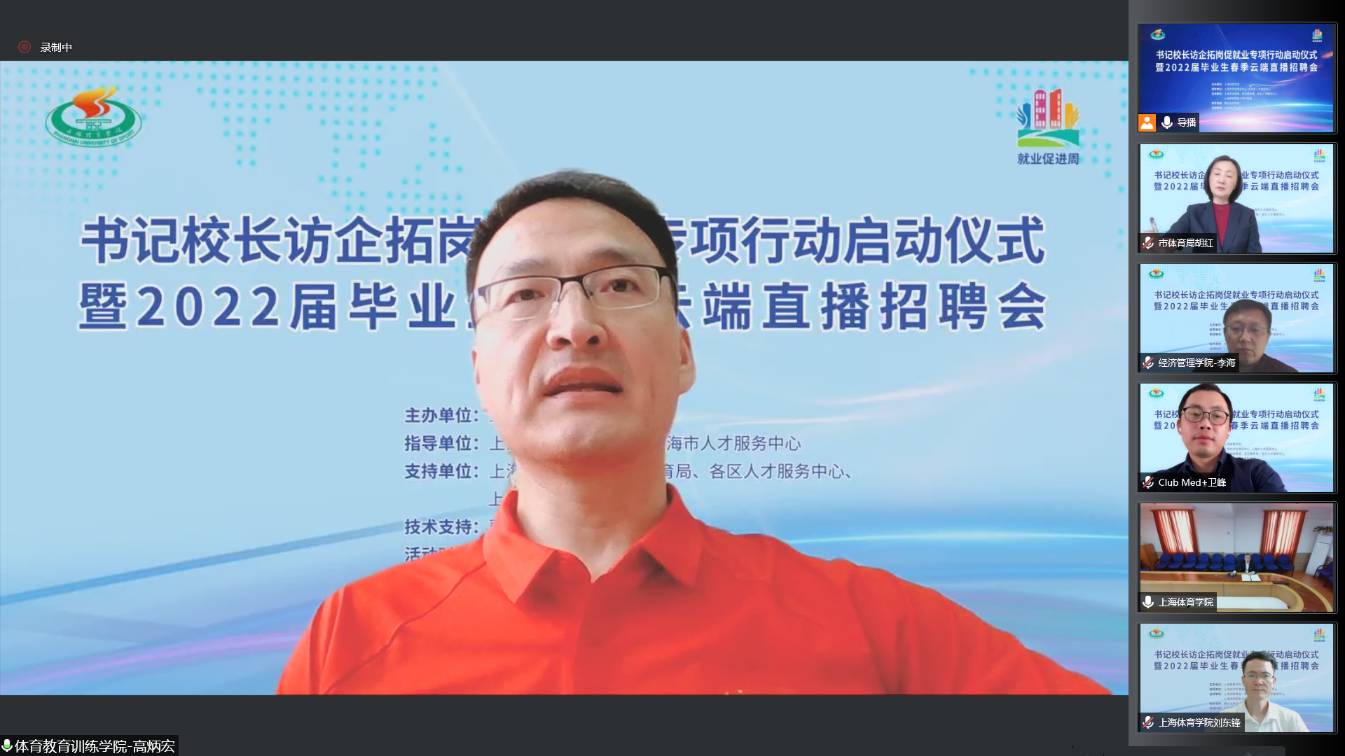 本网讯 近日,教育部部署开展全国高校书记校长访企拓岗促就业专项行动和“百日冲刺”系列活动。为满足各位毕业生的求职需求,最大程度降低疫情带来的影响,全力促进我校2022届毕业生更加充分更高质量就业。5月18日,上海体育学院书记校长访企拓岗促就业专项行动启动仪式暨2022届毕业生春季云端直播招聘会举行。校党委书记李崟、校长陈佩杰出席活动并积极向企业推荐我校毕业生。招聘会由党委副书记、副校长王继红主持。