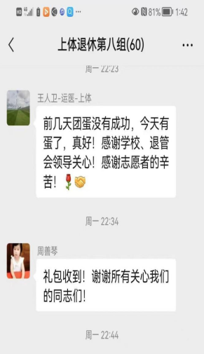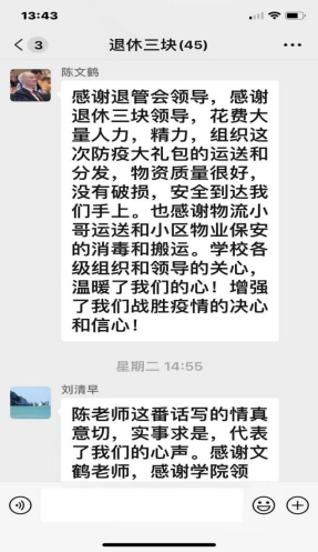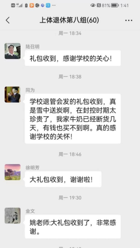 这几天在微信群里、朋友圈里,大家晒出了学校送来的慰问品图片,纷纷配上了感谢的语句:“学校送的抗疫物资大礼包已收到,让我感动不已,还是娘家好呀!”;“感谢学校对离退休教职工的关怀照顾,谢谢你们的辛劳付出,服务周到贴心!祝学校明天更美好!”;“收到慰问品后非常激动,打开一看品种丰富,也很精致新鲜,这是学校、退管会领导对我们离退休老人莫大的关怀,特别暖心,感谢领导,感谢志愿者,你们辛苦了!”老同志们难掩心中的激动,纷纷表示,有学校的关心关爱,有信心和决心战胜这场疫情,为打赢大上海保卫战做一份贡献!