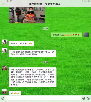疫情发生以来,退休党委认真贯彻学校党委的指示精神,始终关心关注退休人员,想方设法帮助困难人群,将学校的关爱及时送达。4月以来,发挥退休骨干力量,始终关心关注孤老、空巢、独居、患病、高龄、居住养老院等特殊群体,通过排摸,对80余人次的特殊群体给予及时的慰问和帮助,在寻医购药、就餐购物、转运确诊人员等方面,积极协调各方面力量,力所能及地帮助老同志解决急、难、愁等问题,化解了焦虑情绪,解决了实际困难,在党员群众中形成良好的团结互助友爱的的温暖氛围,激励了广大退休人员战胜疫情的信心和决心!