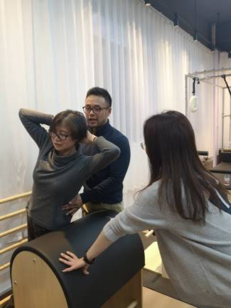 训练环节,女教授们在陆文骏教练,以及休闲学院陆莉萍副教授、杨乔博老师的一对一的指导下,从最基本的拉伸开始,通过器械练习,感受普拉提的魅力。其中的三组活动,老师们都交替进行体验。reformer核心床,通过滑床、弹簧、踏板、带子等设备帮助运动者进行练习,引导运动者的身体在正确的轨道上平面运动;tarpeze table秋千架,通过身体的上下卷动,放松脊柱;ladderbarrel梯桶,根据梯桶的弧度,运动者通过站姿、悬挂、攀爬、倒立等动作伸展脊柱。