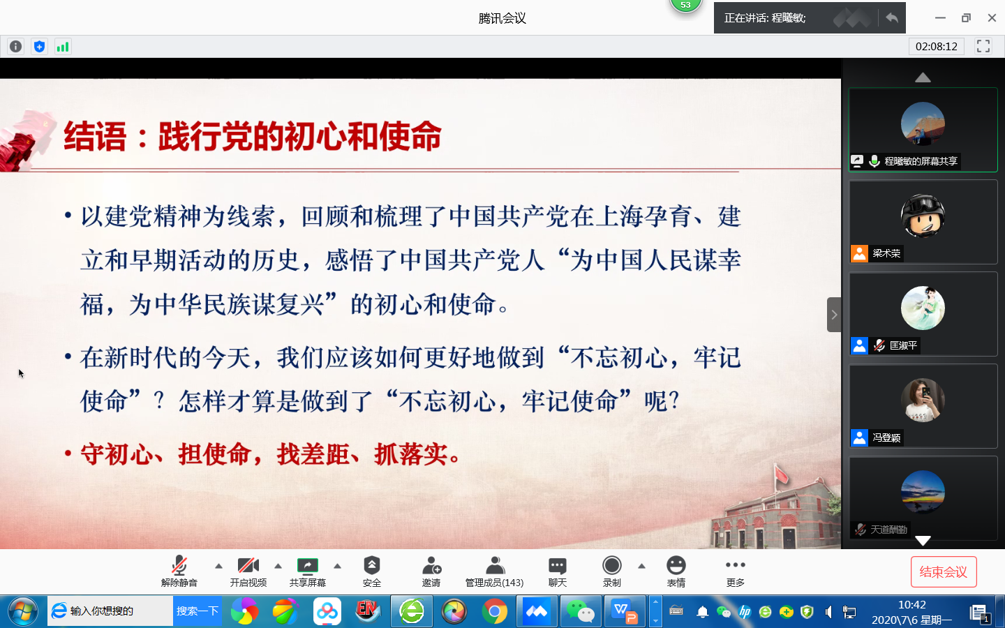 本网讯 7月6日上午,我校举行“四史”学习教育专题培训暨“崇德修身”教师沙龙活动,采取线上学习的形式进行。上海市委党校党史党建教研部程曦敏老师应邀作《重温党的历史,践行初心使命》辅导报告。我校党委副书记、纪委书记詹萌,党委副书记潘勤和中国乒乓球学院、国际教育学院、附属体育职业技术学院、机关党委140余名教师参加本次专题网络培训。党委教师工作部部长、机关党委书记匡淑平主持。