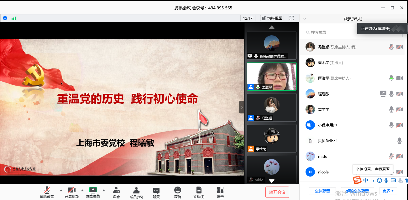程曦敏老师也是上海市习近平新时代中国特色社会主义思想研究中心研究员,华东师范大学历史学博士。报告伊始,程曦敏老师阐述了学习党史,让初心薪火相传,把使命永担在肩的重要性和必要性。接着,以建党精神为线索,回顾和梳理了中国共产党在上海孕育、建立和早期活动的历史,探寻了中国革命的精神源头。一是开天辟地敢为人先,逐步确立初心使命,回顾了中国共产党初心和使命的孕育过程,展现了早期的中国共产党人开天辟地敢为人先的雄伟气魄;二是坚定理想百折不挠,为初心使命而奋斗,再现了早期的中国共产党人在上海开展活动的重重困难;三是立党为公忠诚为民,为初心使命而奉献,展现了中国共产党人始终坚持以人民为中心的实践自觉。最后,程曦敏老师指出,新时代我们要深入学习贯彻习近平新时代中国特色社会主义思想,将其转化为推进改革发展稳定和党的建设各项工作的实际行动;对照初心使命,将其内化为锐意进取、开拓创新的精气神和埋头苦干、真抓实干的自觉行动,为中华民族伟大复兴,为上海改革开放再出发,做出自己新的贡献。程老师讲述内容丰富,史料引用详实,以故事讲述的方式深入浅出、通俗易懂地讲解,参与学习的老师都反馈受益匪浅。老师们也纷纷表示,要做到不忘历史、不忘初心,知史爱党、知史爱国,永葆坚定信念、永葆奋斗精神,助力学校的“双一流”和上海地方高水平大学建设。