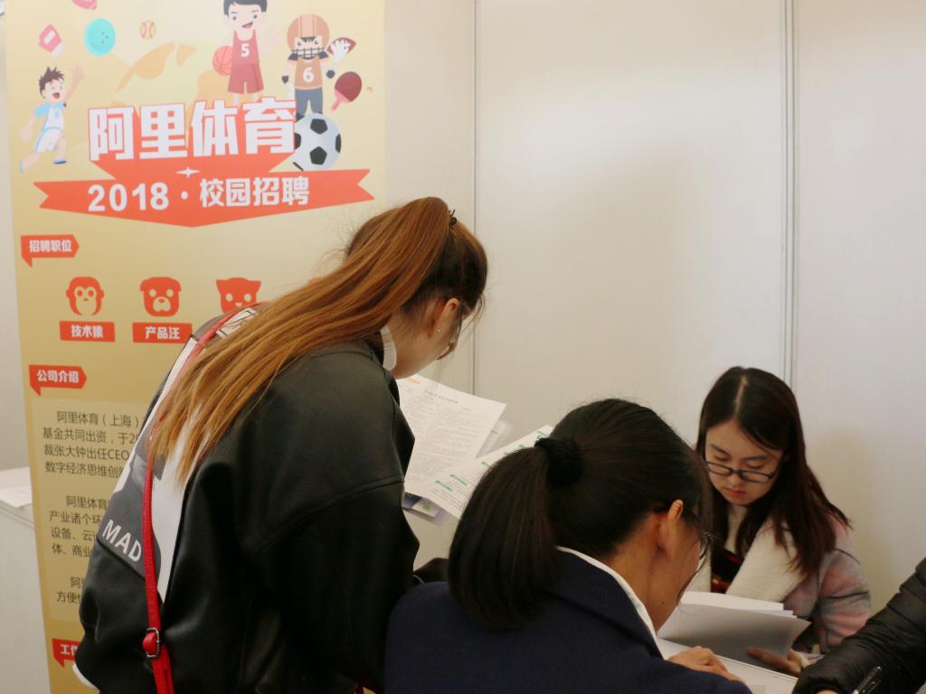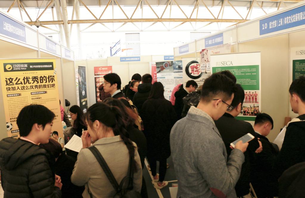 本网讯 11月24日,我校在风雨篮球场举办了2018届毕业生校园招聘会,10家企业进行现场宣讲,170家来自上海、北京、深圳、浙江、苏州、江西等地的用人单位来校招聘。其中包括阿里体育、体奥动力、虎扑体育、拉加代尔等众多体育行业知名企业,上海市多所学校、医疗卫生机构也分别组团来校招聘。参会单位总计提供了500多个岗位,招聘专业囊括我校所有专业大类。