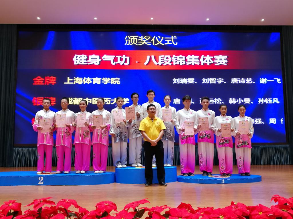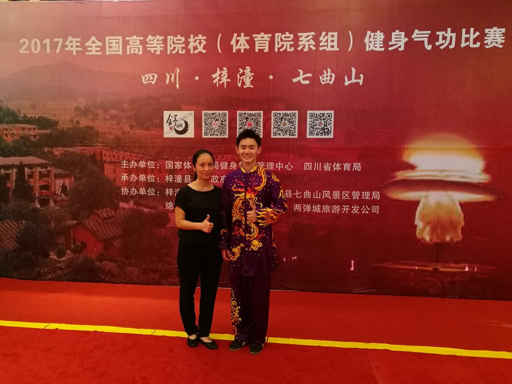 本网讯 7月31日,由国家体育总局健身气功管理中心和四川省体育局主办,绵阳市梓潼县人民政府承办的2017年全国高等院校(体育院系组)健身气功比赛在四川梓潼完美收官。本次比赛,我院共获得了两金一银一铜的优异成绩,获奖项目分别是:集体八段锦(金牌)、集体五禽戏(铜牌)、男子个人五禽戏(金牌)、女子个人五禽戏(银牌)。教练赖剑慧荣获2017年全国高等院校健身气功比赛(体育院系组)体育道德风尚优秀教练奖。