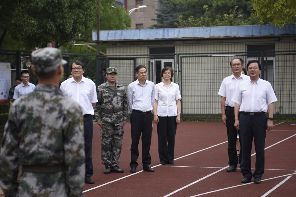 本网讯 6月28日上午8点,我校党委书记戴健,党委副书记、院长陈佩杰,党委副书记、副院长陈晓峰,党委副书记、纪委书记詹萌,副院长平杰、毛丽娟等一行前往东田径场,视察军训工作的开展情况,看望并慰问了正在军训中的2016级全体本科生及承训部队官兵。