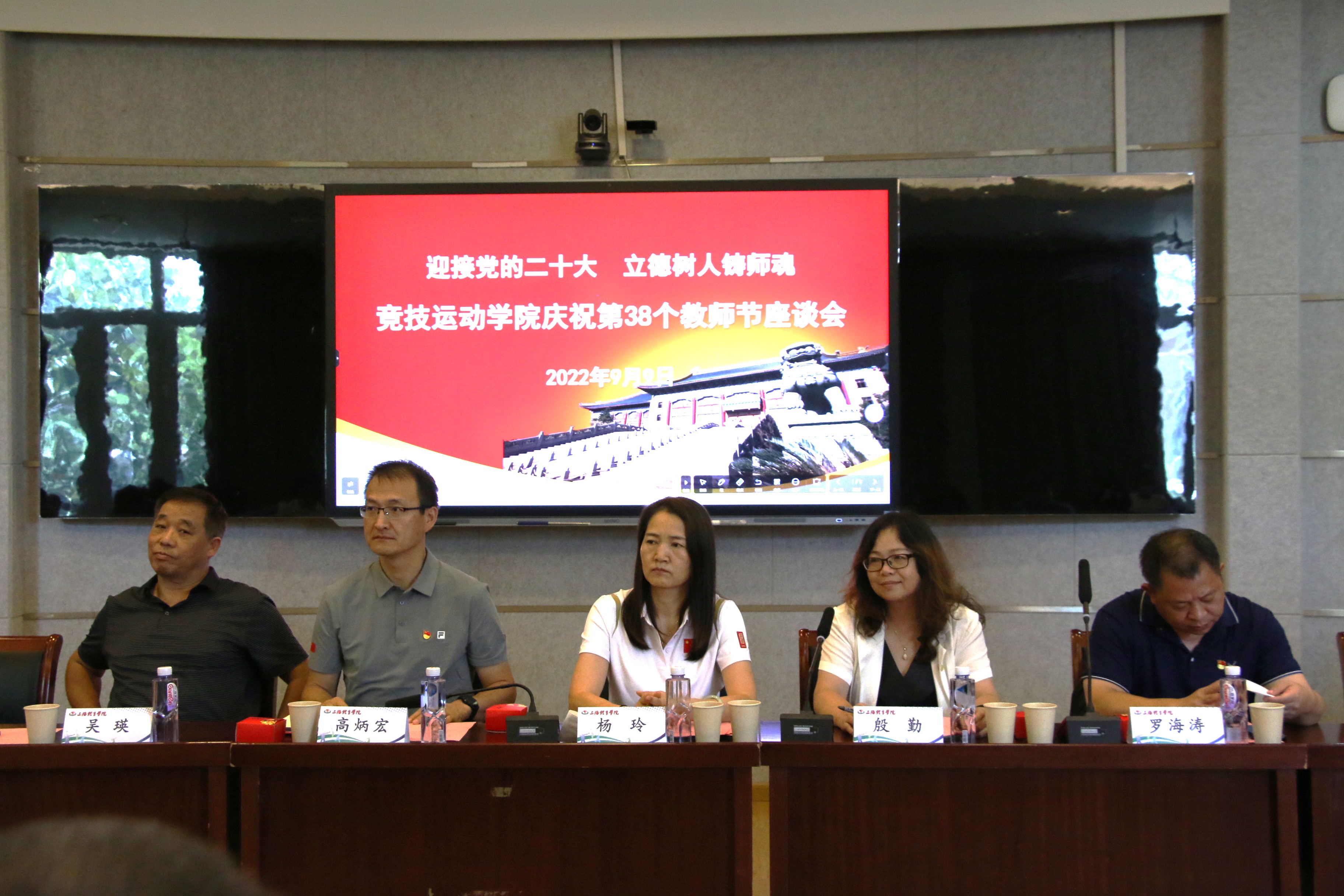 本网讯 9月9日中午,竞技运动学院在1111会议室举行庆祝“迎接党的二十大 立德树人铸师魂”第38个教师节座谈会,上海体育学院党委副书记杨玲出席,竞技运动学院党委书记殷勤、院长高炳宏、副院长罗海涛、退休教师代表吴瑛教授及竞技运动学院教师、教练员代表参会,会议由竞技运动学院党委书记殷勤主持。